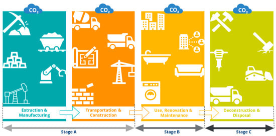 In a building project, GHG emissions occur throughout the entire life cycle, primarily during the product and construction stages (A), use stage (B), and end-of-life stage (C). The total emissions generated across these stages constitute the whole-life carbon (WLC) of the building, which is quantified using a whole-building life-cycle assessment (WBLCA), as schematically illustrated in Figure 1 [1,5,14].