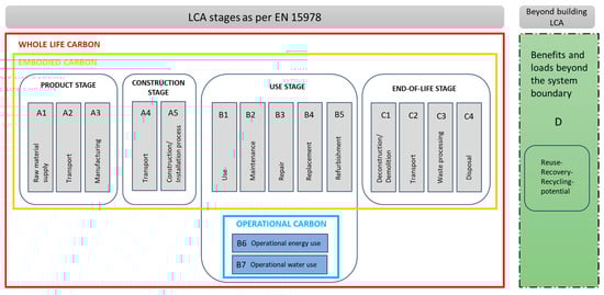 Life-cycle carbon assessment of a building from EN 15978:2011 [21].