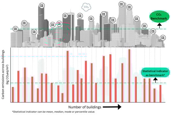 Accordingly, the primary application of benchmarks is to serve as a transparent and consistent reference for assessing and evaluating the energy and environmental performance of buildings. This reference relies on the collection and availability of accurate, verifiable data, as availability can restrain the accuracy of results [13]. This benchmark is typically expressed via statistical indicators (e.g., median, mean, mode, or percentile values) in accordance with the International Energy Agency (IEA) Annex 72 project [26]. This benchmark represents typical building carbon emissions, calculated by combining data from multiple buildings and summarizing data with statistical measures, as depicted in Figure 3 [6,27,28].