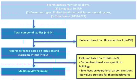 Following the initial search, the retrieved articles were screened based on their titles, abstracts, and keywords to assess their relevance to the research objectives. Studies that did not directly address carbon benchmarks for building construction (e.g., those focused on other sectors, materials, or that only mentioned benchmarks without providing values) were excluded from this review. Of the 304 studies, 190 were excluded. Applying the inclusion criteria reduced the count to 114. After further exclusion, 42 remained, which underwent a thorough review and content analysis to identify key themes, methods, applications, limitations, and gaps related to carbon benchmarks in the building sector. Special attention was given to articles that provided critical insight, innovative approaches, and empirical data to contribute significantly to the understanding of carbon benchmarking practices.