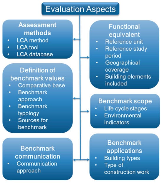 This work has further progressed to a third step based on a report by VITO [82], applying the PEF method for environmental assessment of buildings and constructions. Moreover, this section presents the latest guidelines and recommendations by Annex 72 [26] in accordance with ISO 21678:2022 [23]. Recently, Trigaux et al. [25] presented and analyzed existing environmental benchmarking systems for buildings. They revisited the most commonly employed benchmark systems from standards, labeling schemes, sustainability rating tools, and academic investigations, drawing primarily from older reviews [77,80,81,82] and consultations with field experts from IEA EBC Annex 72 [26,43,83]. This comprehensive analysis of existing benchmarking systems by Trigaux et al. [25] was based on the analytical framework, grounded in methodological reports and literature reviews on LCA benchmarks. The analysis categorized evaluation aspects into six primary domains, each encompassing several sub-aspects. As illustrated in Figure 6, this structured framework enables systematic comparative analysis to assess the effectiveness of benchmarking approaches and methods. Another study provided an overview of 17 benchmarking systems documented in IEA EBC Annex 72, covering a few aspects while discussing the core methodological choices for generating benchmarks [44].