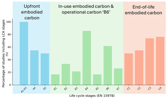 Building on the observed heterogeneity in overall scope completeness, a more detailed examination of how individual life-cycle stages are represented across studies provides further insight into the sources of this variability. Figure 8 presents the proportion of reviewed studies that include each life-cycle stage within their LCA system boundaries. While upfront EC stages (A1–A3) are consistently assessed across all studies, substantial variability is observed for construction, use-phase, and end-of-life stages. Construction-related impacts (A4–A5) and use-phase processes (B2–B5) are frequently omitted, with inclusion rates below 50% in most cases. Although end-of-life stages (C1–C4) are more commonly addressed, their treatment remains inconsistent, which means they are modeled with simplified or generic assumptions. These findings highlight a persistent imbalance in system boundary definition within the literature and underscore the need for more comprehensive and harmonized whole-life carbon assessments.
