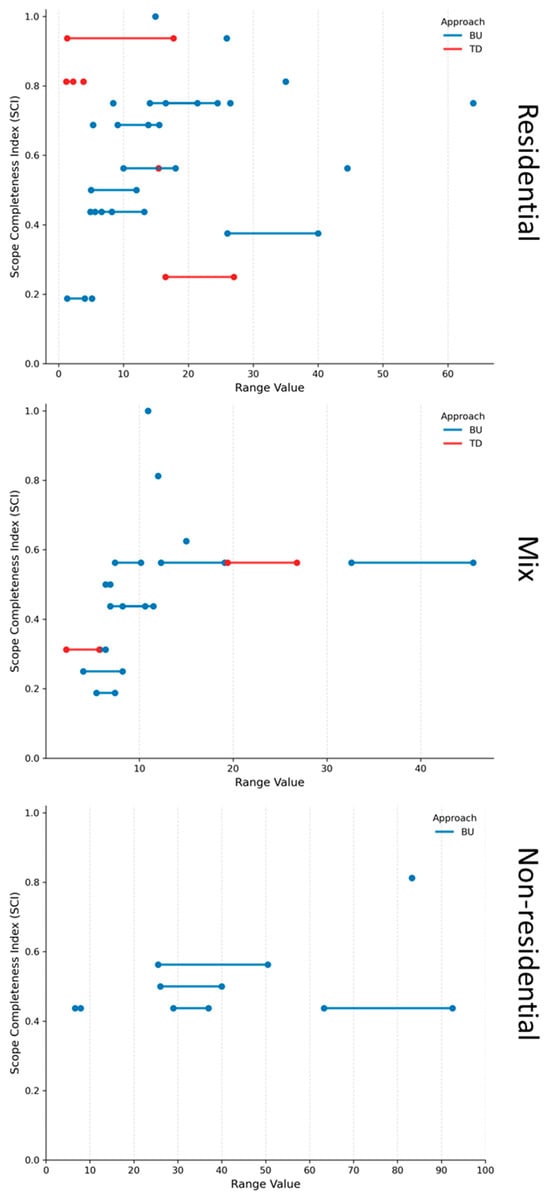 Figure 9 further explores the relationship between benchmark magnitude and system boundary completeness by plotting benchmark range values (kg CO2e/m2/year) against the SCI. A wide dispersion of benchmark values is observed across the full range of SCI scores, indicating that higher SCI values do not systematically correspond to higher benchmark values, nor do lower SCI values consistently result in lower benchmarks. Studies with relatively high SCI exhibit both low and high carbon intensities, while studies with limited scope coverage can also report comparatively high benchmark values. This lack of a monotonic relationship demonstrates that magnitude is influenced not only by life-cycle stage coverage but also by a combination of other methodological and contextual factors, including building typology, energy performance level, data sources, modeling assumptions, sample size, and regional context. Consequently, SCI should be interpreted as an indicator of methodological completeness rather than a direct proxy for benchmark stringency or carbon intensity. Results are differentiated for residential, non-residential, and mixed building samples, as well as by benchmark development approach.