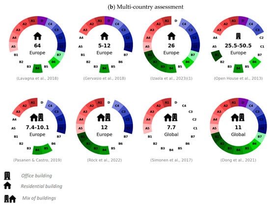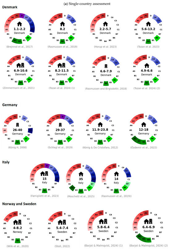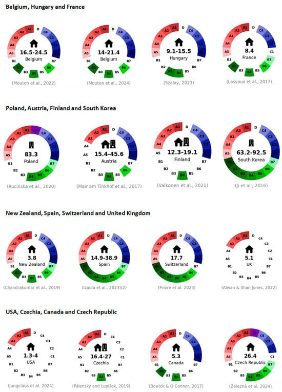 A visual summary of the studies across different countries, illustrating their LCA scopes, value ranges (kg CO2e/m2/year), and building typologies to complement the detailed data presented in Table 3 and provided at the end for a quick overview (Figure 10). For residential buildings, several examples illustrate how benchmark values can vary despite similar or even lower SCI values. In Germany, studies by König and Cristoforo [87] report lower SCI values than Özdemir et al. [111], yet the benchmark values reported by the latter are higher. This difference is primarily attributed to building energy performance assumptions: Özdemir considers buildings designed to meet stricter energy performance levels (40 and 55) under the German Building Energy Act (GEG 2020), whereas König’s study is based on earlier EnEV 2009 requirements, which allow higher energy demand. Similarly, Belgian studies [108,118] have the same SCI but report lower benchmark values for the latter due to a larger and more representative building sample. In France [93], despite a relatively high SCI (~0.75), benchmark values remain low, reflecting the focus on low-energy buildings aligned with national thermal regulations that limit primary energy demand to 50 kWh/m2/year. In contrast, studies from Hungary [115] adopt typical construction systems to represent business-as-usual conditions, resulting in higher benchmarks. The Czech Republic [120] exhibits high benchmark values despite extensive scope coverage, largely due to the dominant contribution of OC, which accounts for approximately 59% of total emissions. Similarly, in Spain, where full WLC is assessed, higher benchmark values are driven primarily by operational emissions, whereas lower benchmark values correspond to cases with low-carbon scenarios.