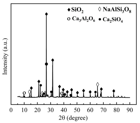 The fine aggregate used is from excavated CRS provided by Beijing Jianghong Technology Co., Ltd., Beijing, China, which is ultra-fine sand with high mud content; its sieve test and physical properties are shown in Table 1 and Table 2, respectively, and the mineral composition is shown in Figure 1.