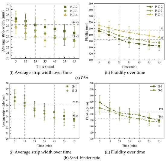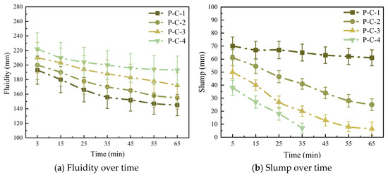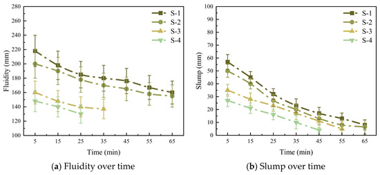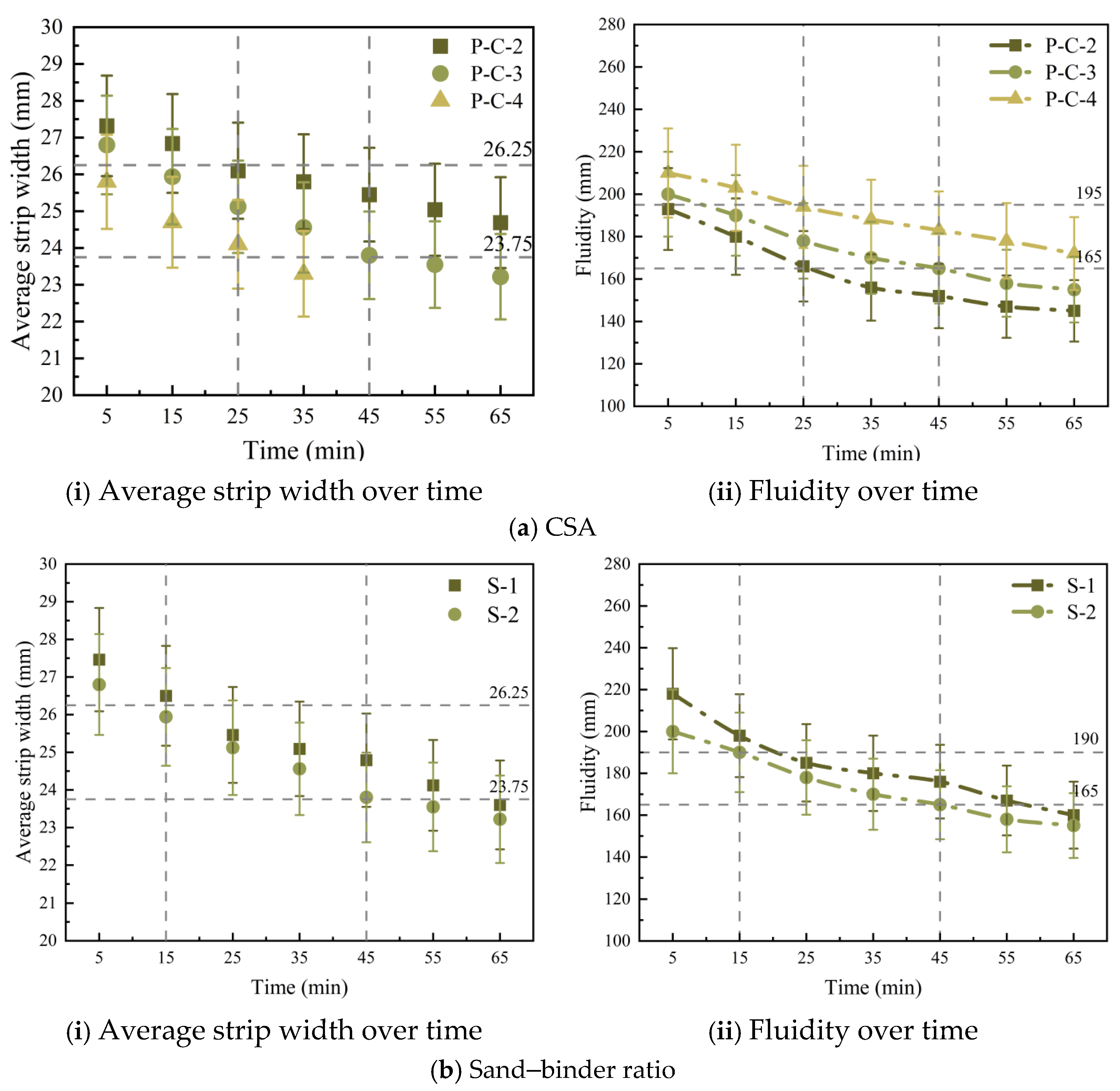 Because the fine aggregate used in this study is an ultra-fine waste soil sand with high mud content, it has strong water absorption, which leads to a greater loss of fluidity of the slurry per unit time. The clay fines form a loose and porous structure in the interfacial transition zone (ITZ) [27], which degrades the mechanical properties. Therefore, a slump-retaining polycarboxylate superplasticizer (PCE) combined with a slump-retaining solution was selected for preliminary testing. In these pre-tests, the total dosage of PCE and slump-retaining solution was 2.5% of the binder mass, and the results are shown in Figure 5.