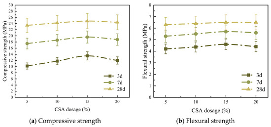 The effect of CSA dosage on the mechanical properties of cement mortar specimens is shown in Figure 7.