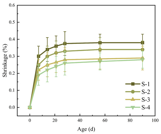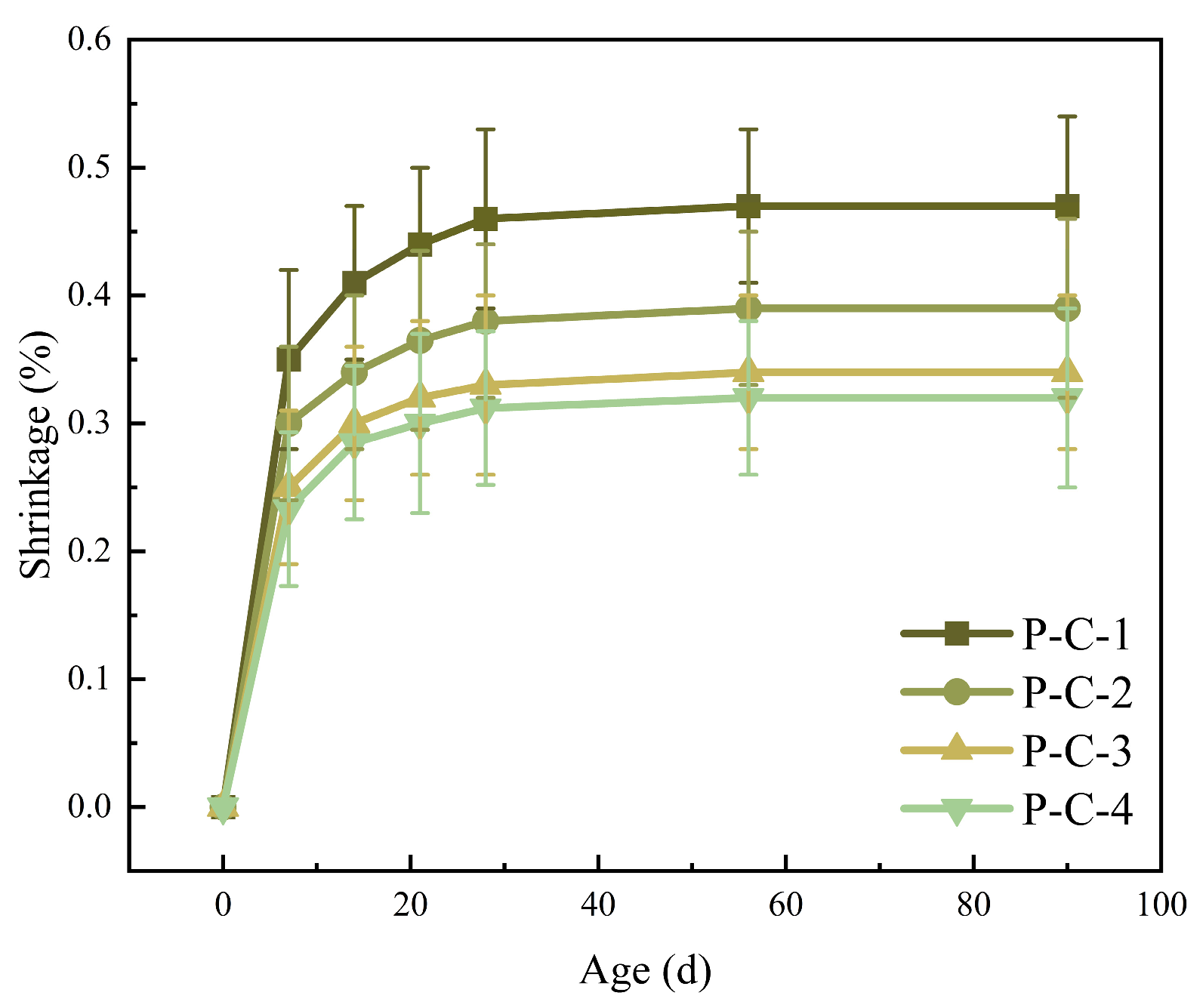 The drying shrinkage was measured in accordance with JGJ/T 70-2009 [21], and the arithmetic mean of the two results was taken. The initial length of each specimen and its length after 7, 14, 21, 28, 56, and 90 d were recorded.