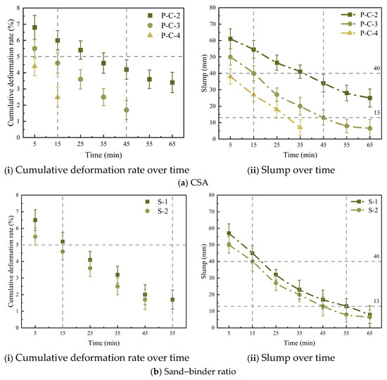 As shown in Figure 9, both the initial fluidity and slump decrease as the sand–binder ratio increases, and they continue to decline over time. A higher CRS content absorbs more water, reducing the effective water–binder ratio and decreasing the volume of slurry. At the same time, the increased specific surface area of the aggregate thins the slurry film and increases friction between particles [32], resulting in lower fluidity and slump. In addition, the higher sand content improves the internal skeleton of the mixture, increasing its packing ability and reducing deformation, which further contributes to the reduction in slump.