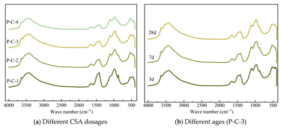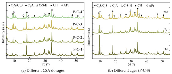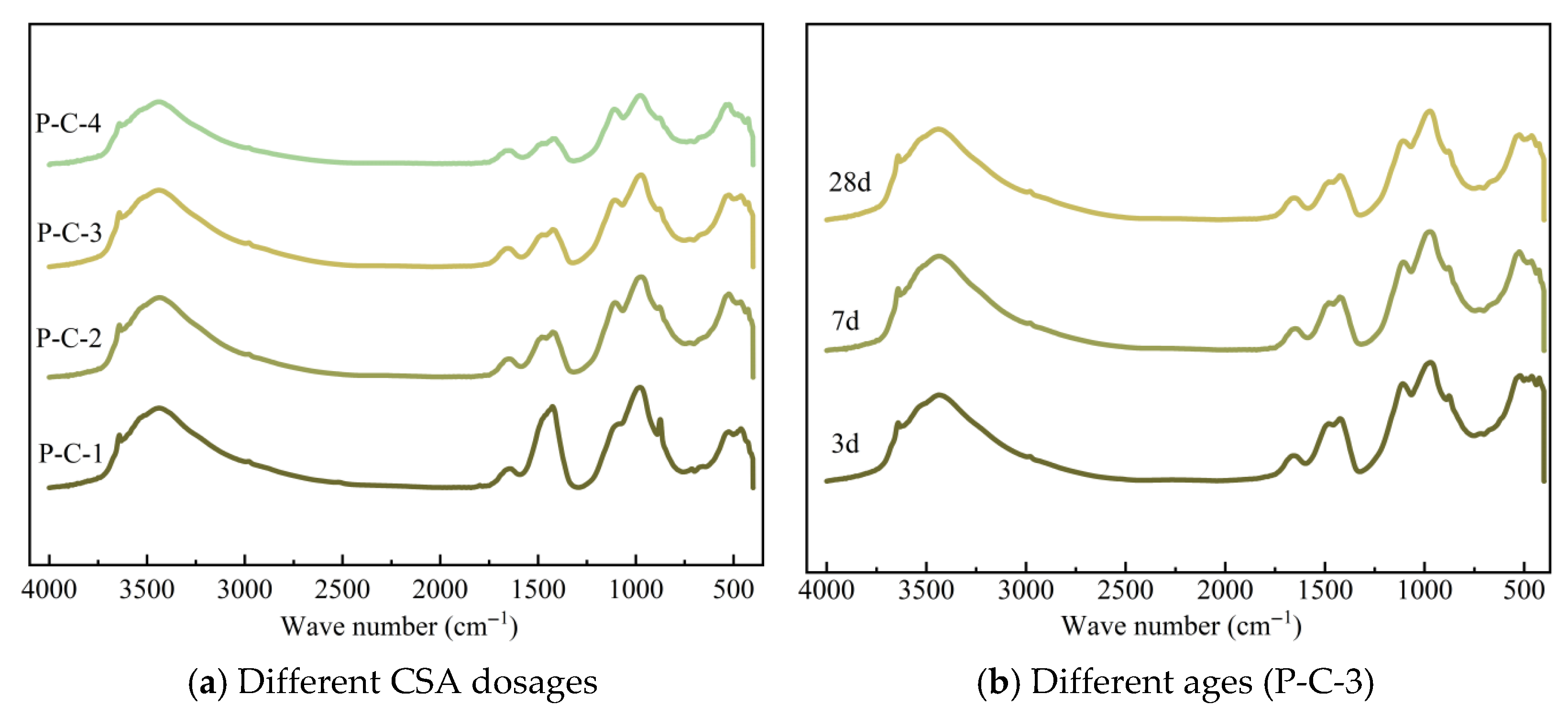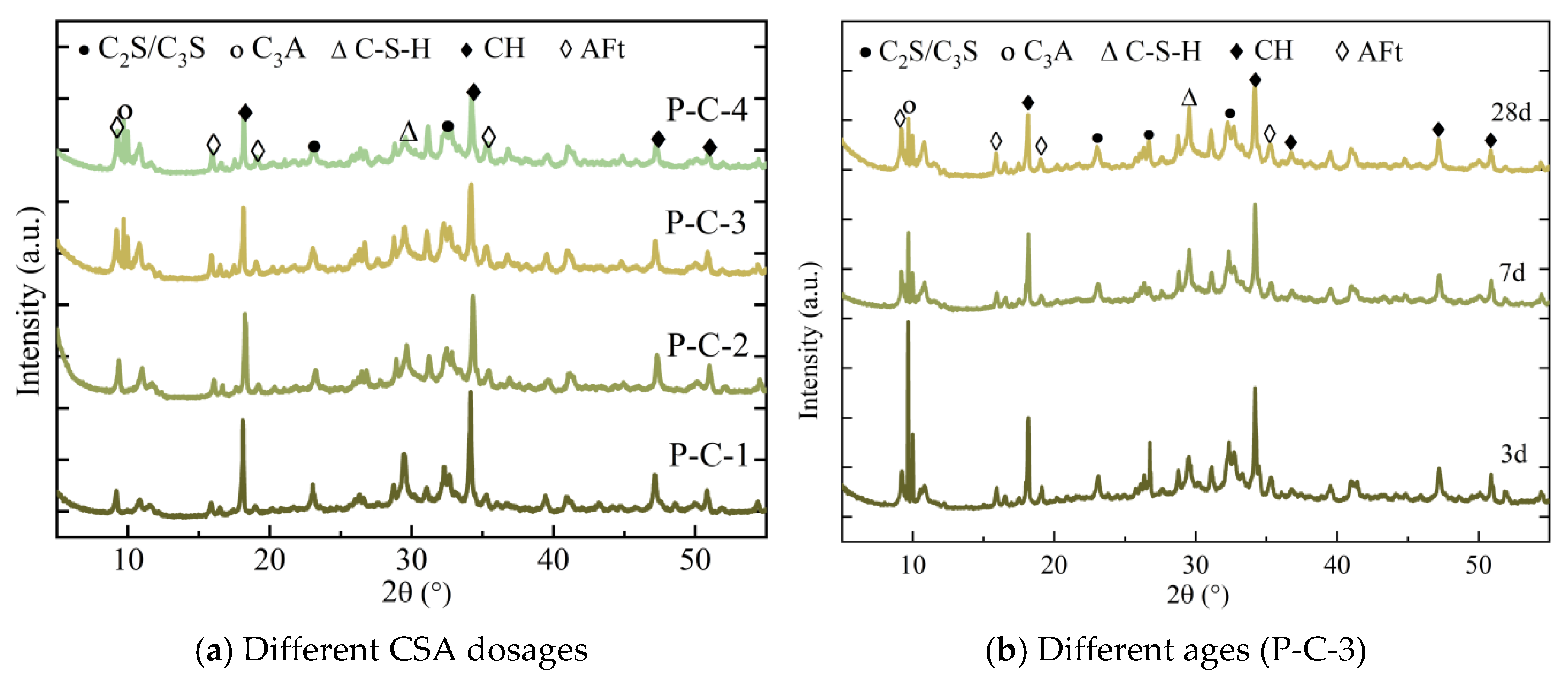 As shown in Figure 7, when the CSA dosage is ≤15%, increasing the dosage enhances the specimen strength; however, the strength gain from 3 d to 7 d becomes smaller. This is because the early strength is mainly governed by AFt formed from CSA hydration. Once a rigid skeleton has rapidly developed, further filling and densification by C-S-H gel produced from PO hydration proceed more slowly and over a longer period. When the CSA dosage reaches 15%, the concentrated heat of hydration leads to an excessive growth of AFt crystals. The resulting micro-expansion fills pores at the clay–cement interface but also envelops PO particles and hinders their hydration, introducing microstructural defects into the PO-CSA composite and reducing strength [30]. At 28 d, the strength improves: with extended curing, continued PO hydration breaks the AFt coating, and the newly exposed PO particles hydrate to form C-S-H gel, which interlocks with AFt to create a denser network. The secondary hydration of fly ash further contributes to the later-age strength [31]. Therefore, a moderate CSA dosage improves strength, whereas excessive CSA reduces early strength but has a relatively small effect on long-term strength.