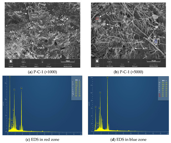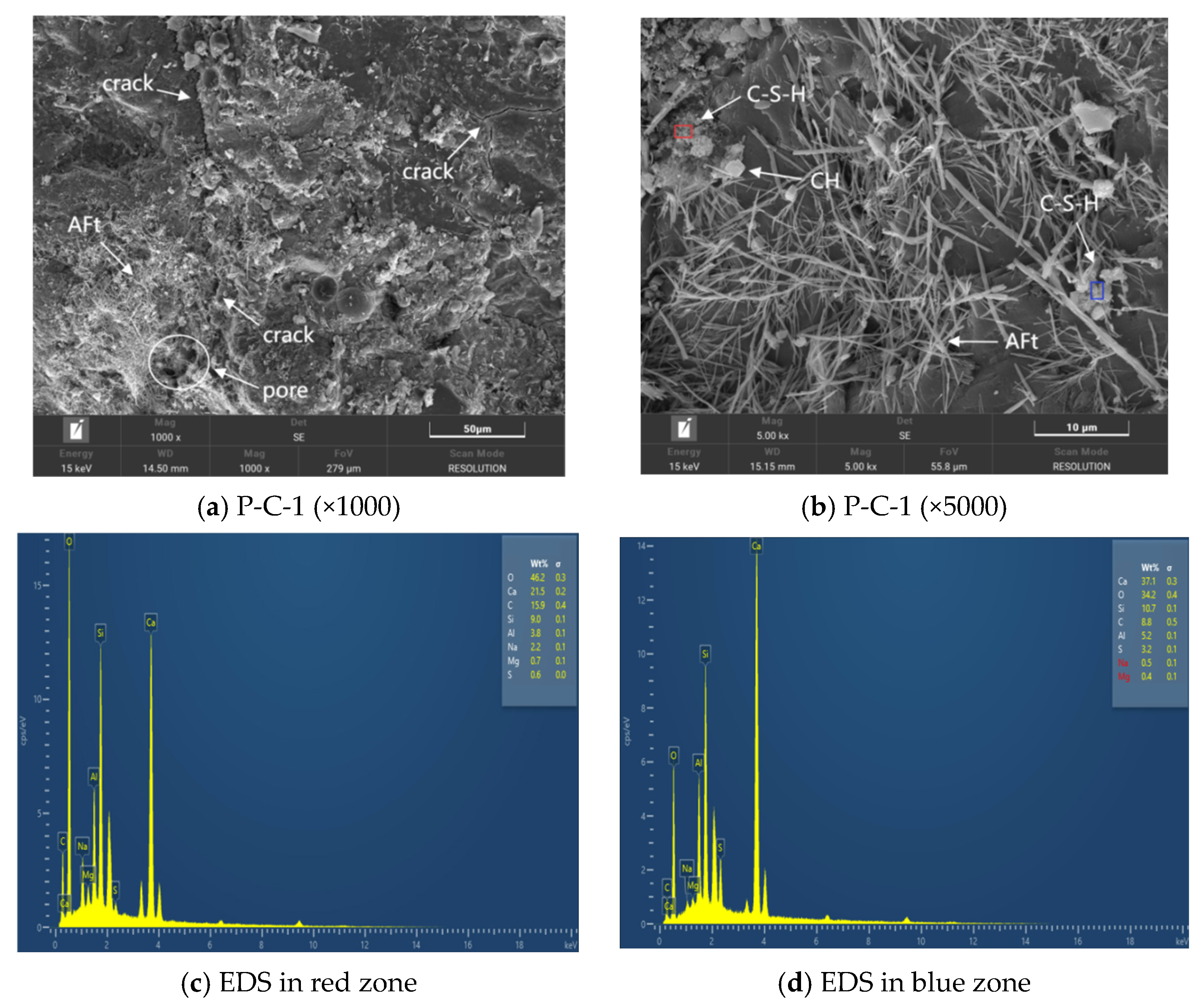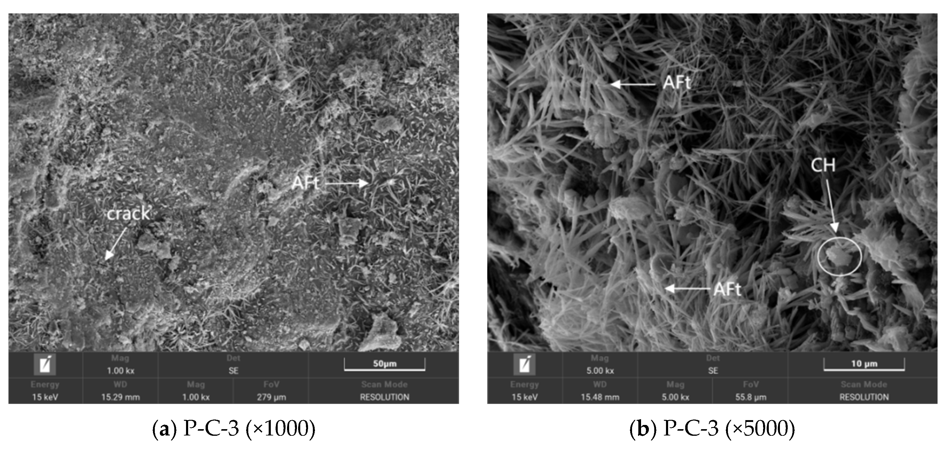 As shown in Figure 8, the shrinkage strain increases with curing age, and most of this increase occurs before 7 d. During the early curing stage, the slurry is still hardening: the solid skeleton is not yet fully formed, the microstructure is relatively open, and moisture is lost rapidly, which leads to significant shrinkage. From 7 to 14 d, the rate of increase in shrinkage gradually decreases, and after 28 d it becomes essentially stable. CSA can reduce drying shrinkage, and the shrinkage strain decreases progressively as the CSA dosage increases. Drying shrinkage is mainly caused by water loss from capillary pores in the hardened cement slurry. This water loss generates curved liquid surfaces and capillary tension, which in turn induce shrinkage. The main hydration product of PO, C-S-H gel, loses water readily in a dry environment, creating additional pores and increasing the shrinkage of the slurry. In contrast, the main hydration product of CSA, Aft, provides a compensating expansion effect. Consequently, the shrinkage strain is closely related to the type and quantity of hydration products. CSA develops strength rapidly at early ages, which helps the cement slurry form a stable structure during the initial curing period and thereby reduces drying shrinkage caused by moisture loss. However, when the CSA dosages exceeds 15%, its ability to restrain shrinkage begins to decline, because excessive CSA concentrates the heat of hydration and promotes the formation of microcracks. Therefore, using CSA within an appropriate dosage range is effective for reducing drying shrinkage.