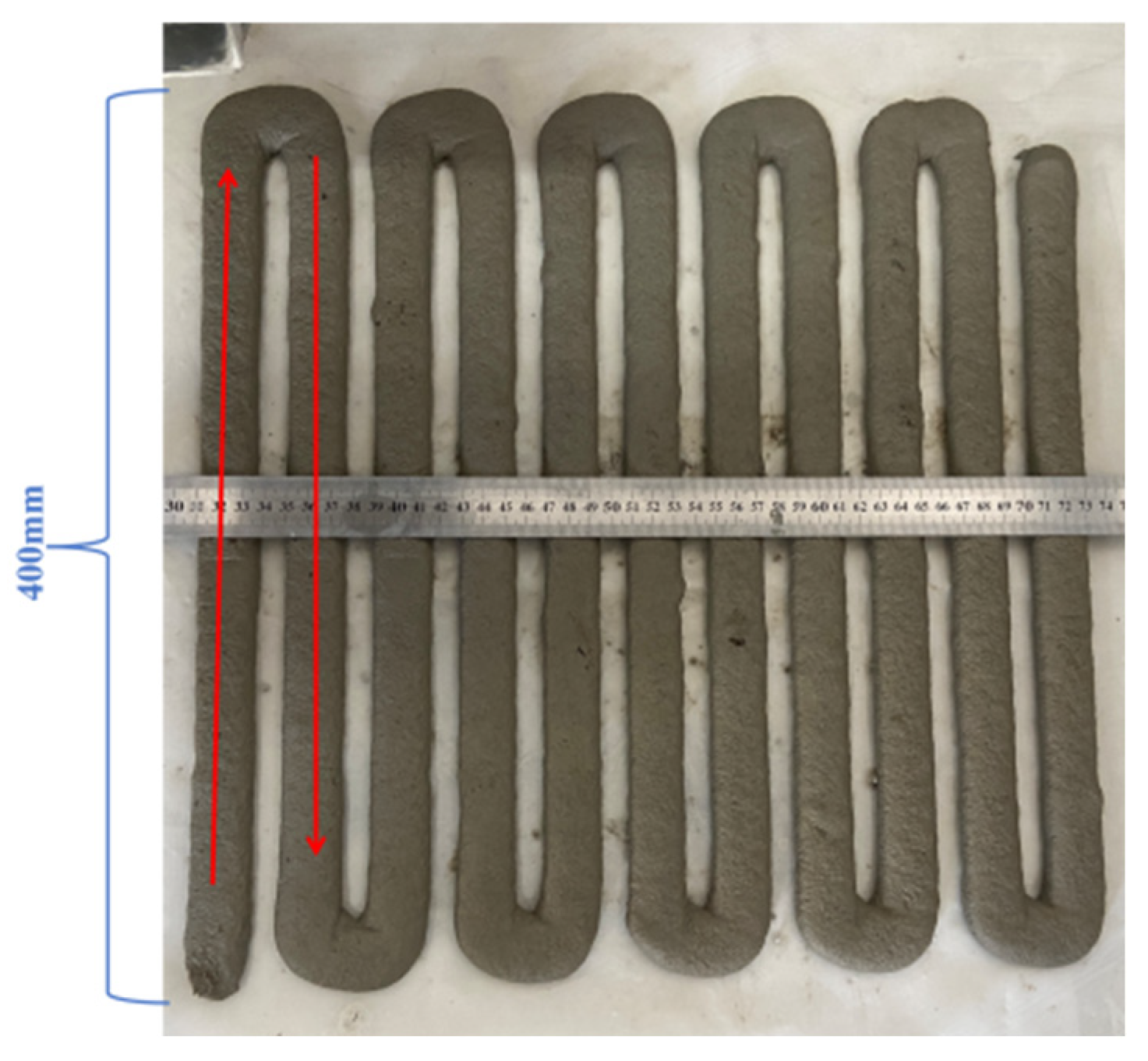 The printing operation time was defined as the duration for which the fluidity remained ≥150 mm in the fluidity over time tests. On the basis of the qualitative criteria for extrudability and constructability specified in T/CECS 786-2020 [22], quantitative evaluation methods were established. For extrudability, a mixture was considered to have good extrudability when the difference between the average measured width of the printed strips and the design width was within ±5%, while also satisfying the qualitative criteria. To this end, 11 continuous strips, each 400 mm in length, were printed. The measurement procedure and the printing path for the extrudability test are illustrated in Figure 2. The strip width was measured at the mid-length of each strip, and the arithmetic mean of all strip widths was calculated. For constructability, a mixture was considered to have good constructability when 20 layers could be printed continuously, and the cumulative deformation ratio of the 3D-printed specimen was ≤5%. Mixtures that could not complete 20 consecutive layers were regarded as non-buildable and were not subjected to the cumulative deformation test. The test method and printing path for cumulative deformation are shown in Figure 3, and the corresponding calculation formula is given in Equation (1):
