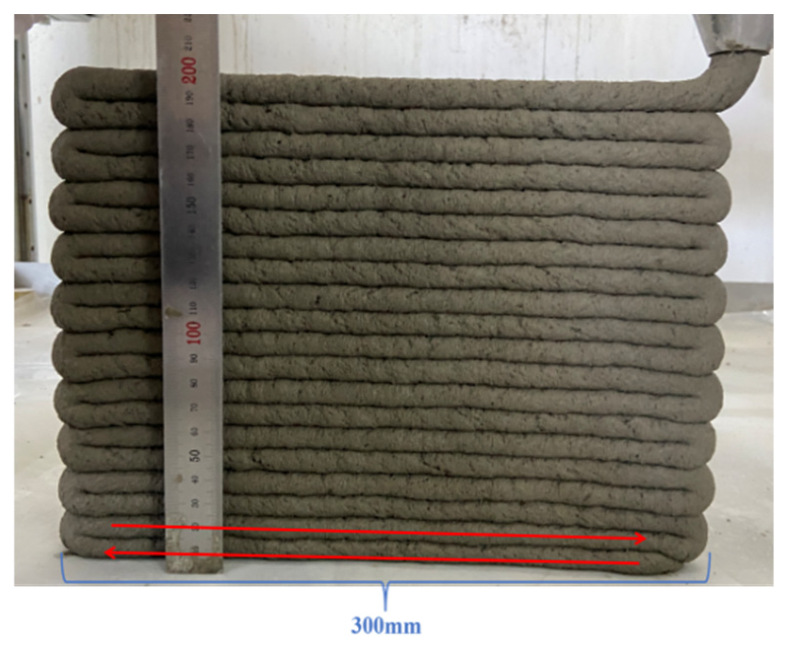 The printing parameters in this study were set as follows: an extrusion rate of 1.0 cm3/s, a horizontal printing speed of 30 mm/s, a vertical lifting speed of 5 mm/s, and a nozzle diameter of 20 mm. The ambient temperature was maintained at (23 ± 2) °C, with a relative humidity of (60 ± 5)%.