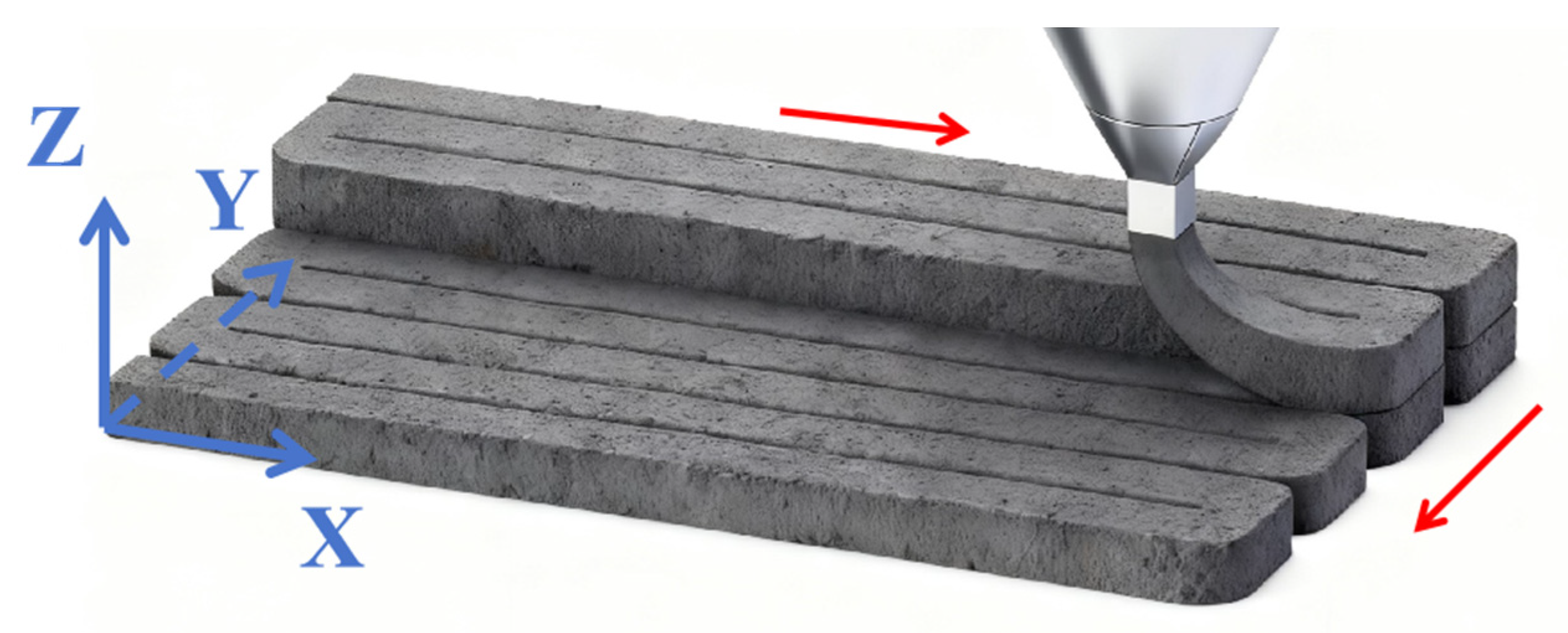 The compressive and flexural strengths of the mortar specimens were measured in accordance with GB/T 17671-2021 [25], the compressive strength was taken as the arithmetic mean of six measured values, and the flexural strength was taken as the arithmetic mean of three measured values. For the 3D-printed specimens, a block with dimensions 200 mm × 200 mm × 160 mm was first printed and then cut into prisms of 40 mm × 40 mm × 160 mm. The layer height was set to 10 mm, and the width of each printed strip was 25 mm. To ensure that all prisms contained the same number and arrangement of interlayer and interstrip interfaces, cuts were made every 40 mm (i.e., every four layers) in the vertical direction, and every 50 mm (corresponding to the width of two strips) in the horizontal direction, with the first cut at 40 mm. The resulting specimens were then tested for strength in the X, Y, and Z directions, as illustrated in Figure 4. The strength reduction factor was calculated according to T/CECS 786-2020 [22], and the mechanical anisotropy index [26] was obtained using Equation (2):