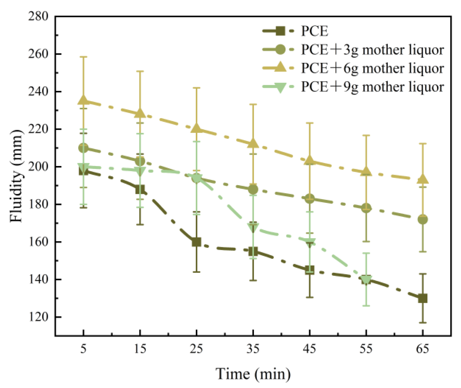 (2) Fluidity: Tested in accordance with GB/T 2419-2005 [23], a table jump test was performed at 5, 15, 25, 35, 45, 55, and 65 min after mixing, and the fluidity over time was recorded.