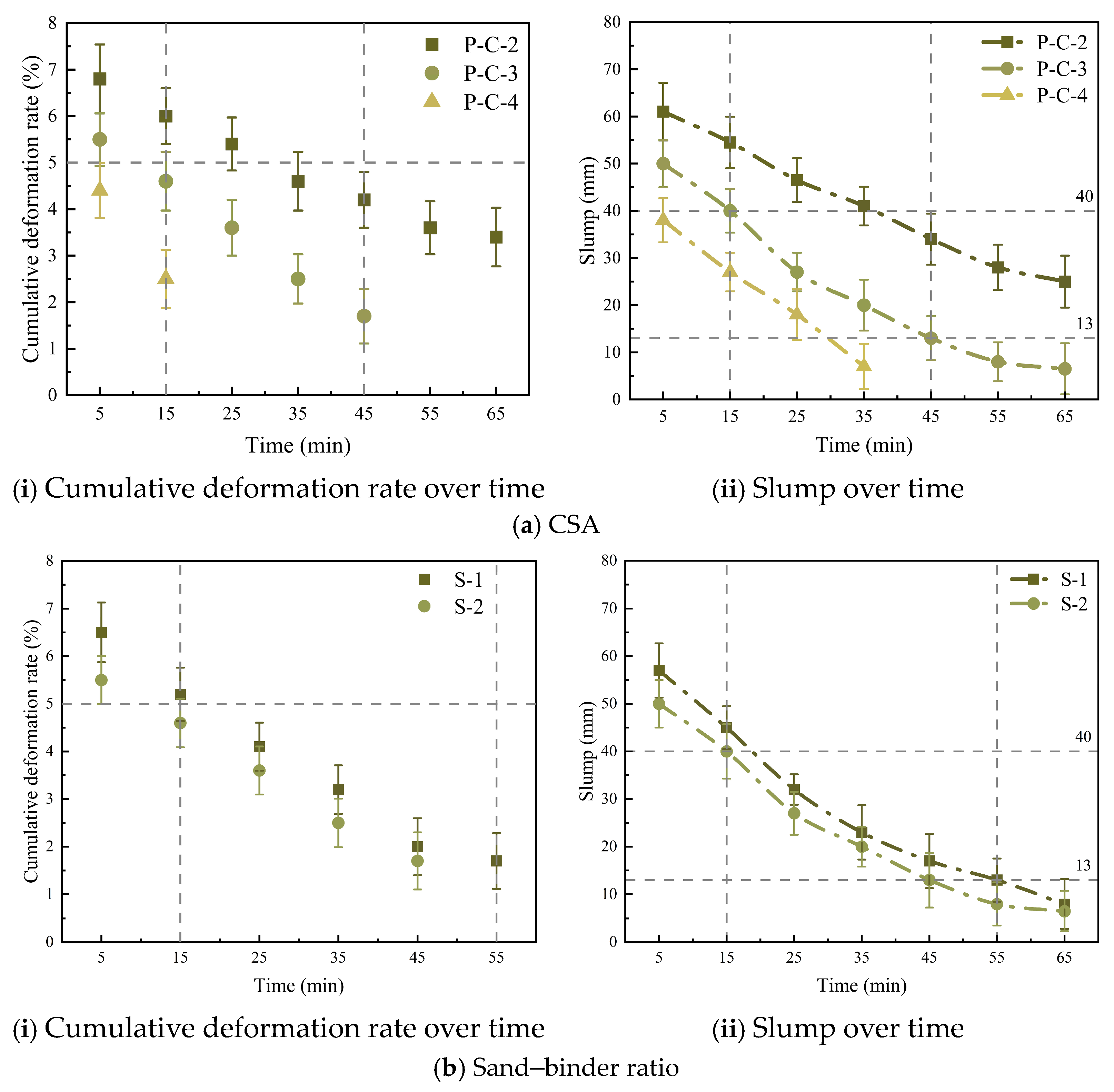 The effect of the sand–binder ratio on setting time is as follows: 1.4: 75 min > 1.5: 68 min > 1.6: 60 min > 1.7: 55 min. The setting time decreases markedly as the sand–binder ratio increases. A higher ratio requires more CRS, which absorbs additional free water and reduces the amount of water available for hydration, thereby accelerating setting. For sand–binder ratios between 1.4 and 1.7, the setting time remains within 90 min. The influence of the sand–binder ratio on fluidity and slump over time is shown in Figure 9.
