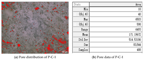 To further analyze the effects of CSA dosages on the internal pore structure, images magnified 500 times were captured using an ultra-depth 3D microscope and then processed using Image-Pro Plus image 6.0 software. The red areas in the figure represent pores. The super-depth images of samples with different CSA dosages are shown in Figure 18.
