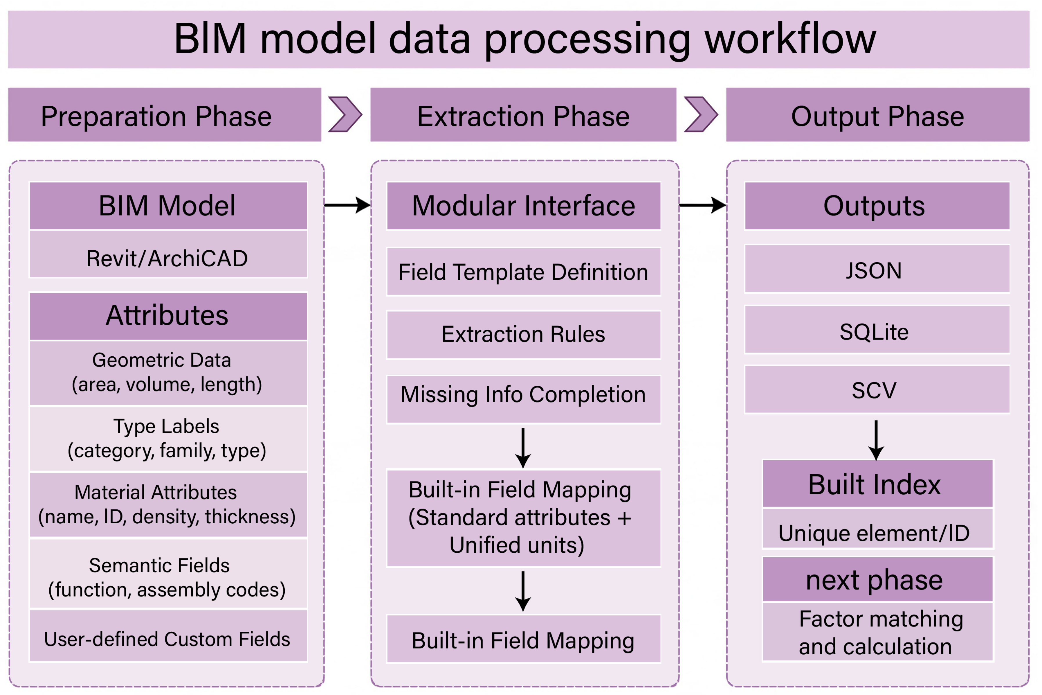 | Tally | Revit plugin; model inventory; database-based accounting; | Primarily Revit-based; higher Level of Development (LoD); scenarios with relatively complete inventories; | Embedded in the modeling environment; closed-loop workflow; fast feedback; | Relies on proprietary regional datasets; limited localization; limited source transparency; mapping and template mechanisms are mostly implemented internally; | [35,36,37] |