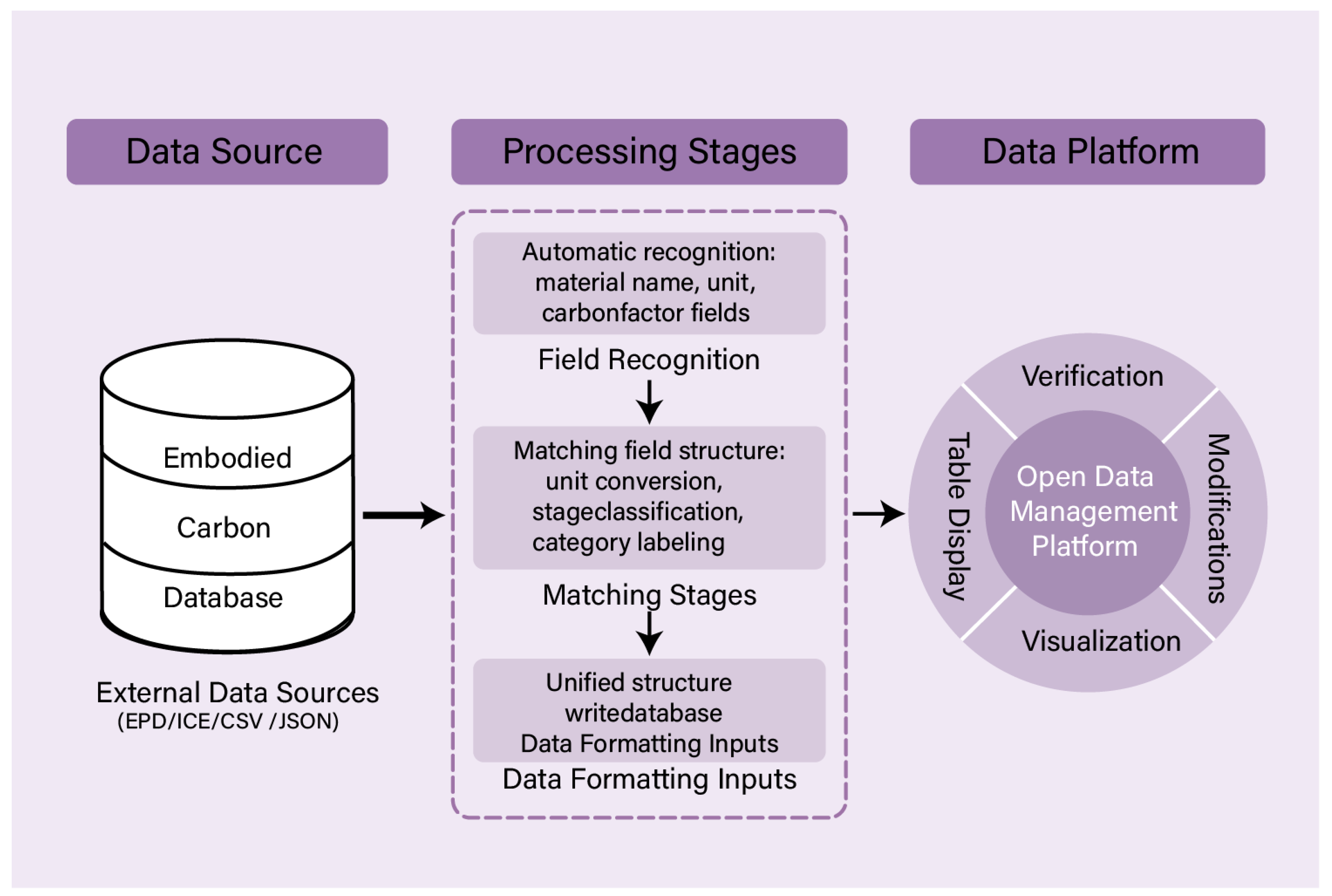 - Carbon factors and assembly templates are externalized to an open data platform and governed with source metadata and version records to improve traceability.