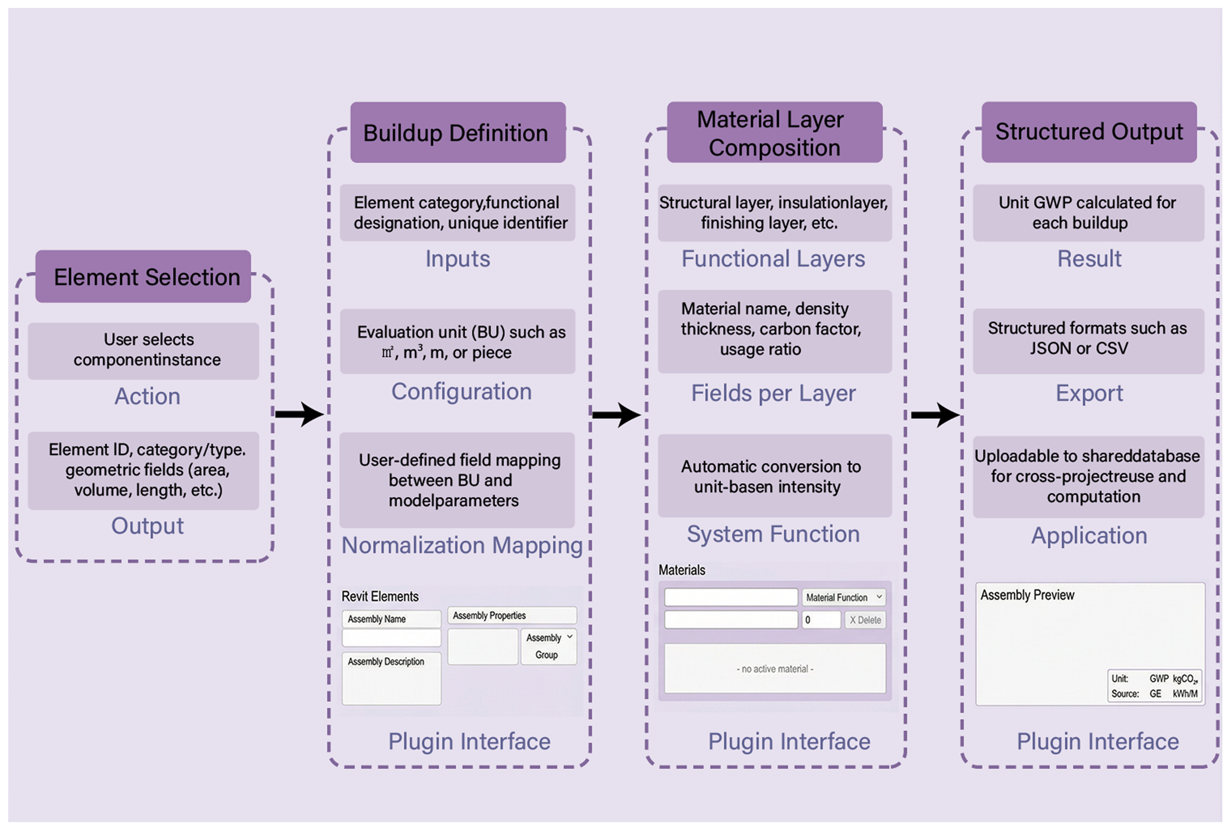 | Embedded plugin | LCA database plugin/API BIM software | Trigger calculation in the modeling environment and return component-level results | More timely feedback; closer to design workflows; supports in-model display | Results are sensitive to database and template assumptions; rules are often built in, limiting auditing and transferability | [27,28] |