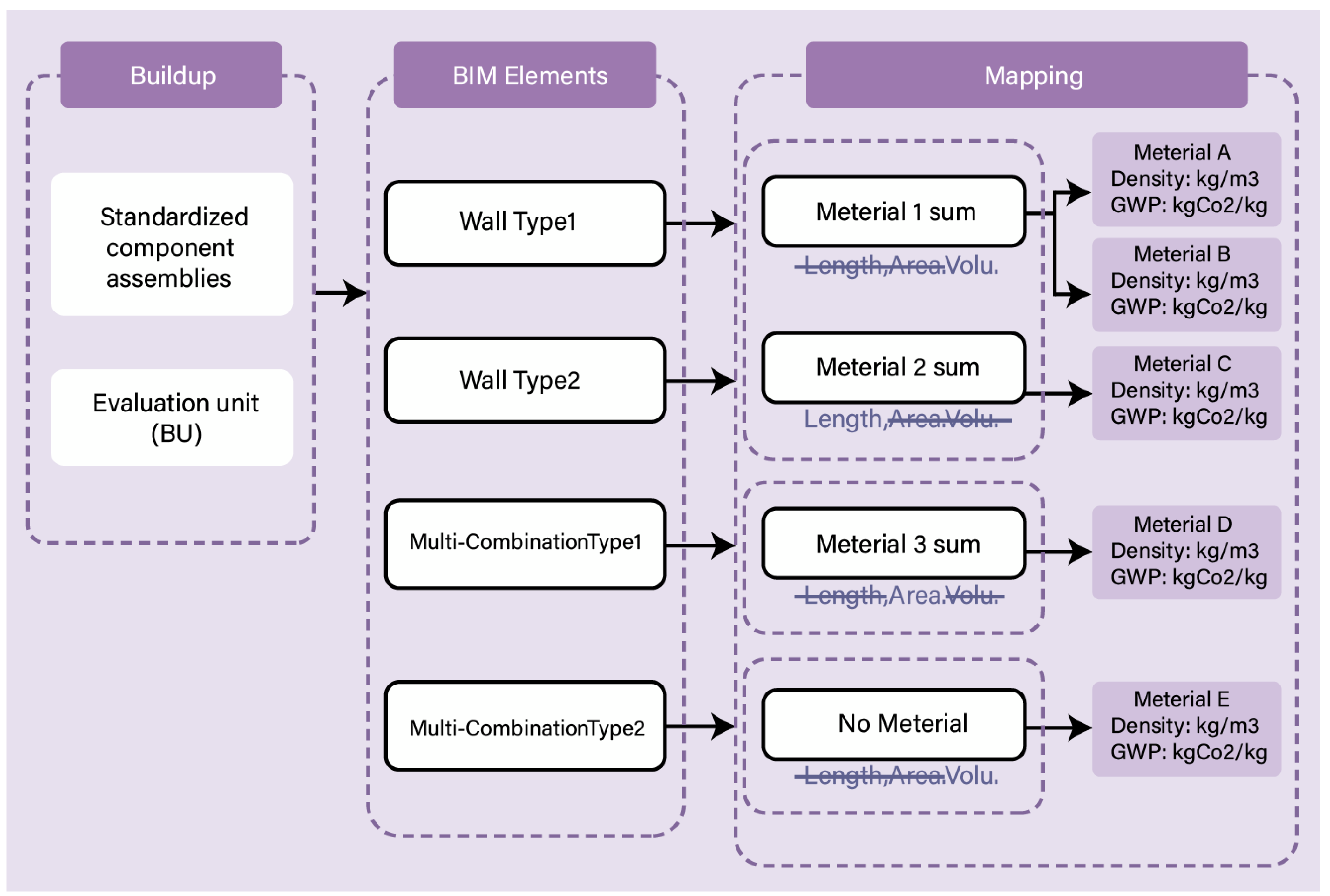 | Parametric programming | parameterized LCA information BIM software | Explicitly organize mapping logic at the scripting layer and write results back to the model | Mapping logic is explicit; flexible; facilitates multi-scheme comparison | Scripts are often project-specific; high maintenance and transfer costs; limited compatibility with complex assemblies | [24,29] |