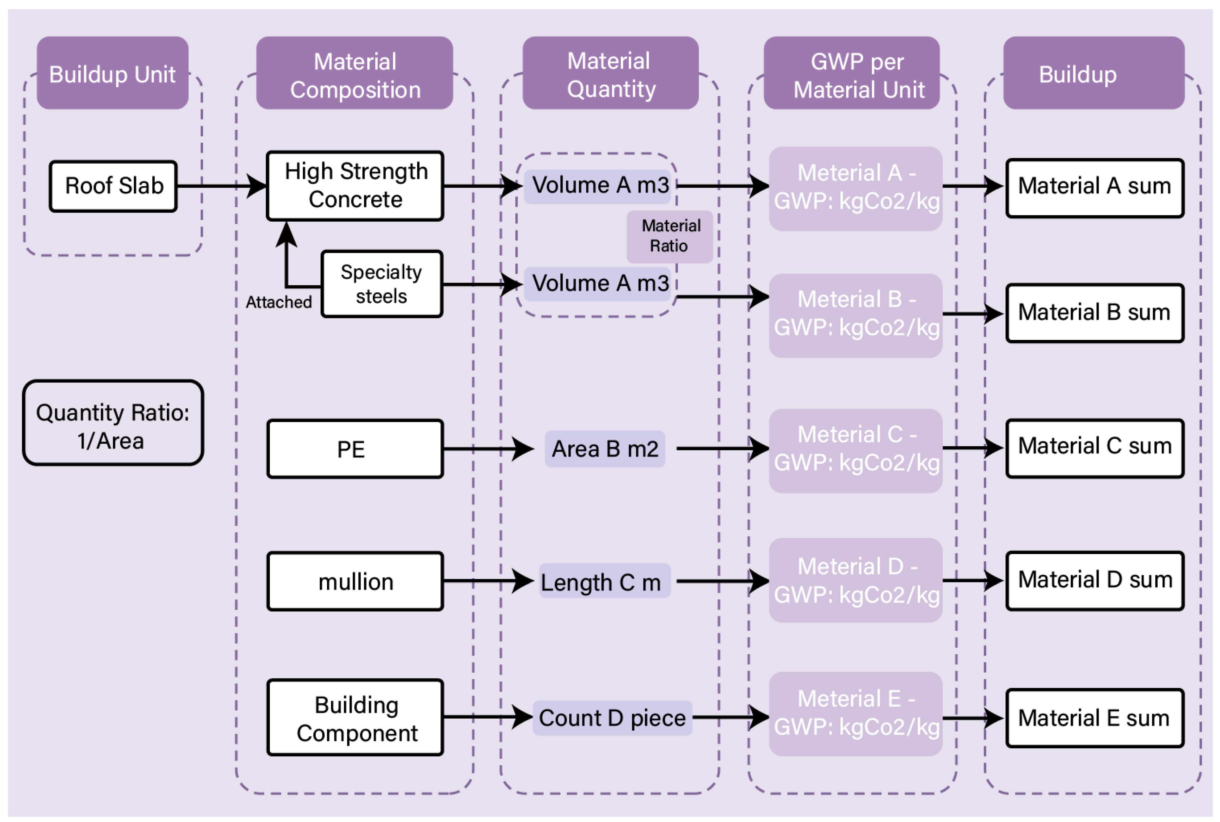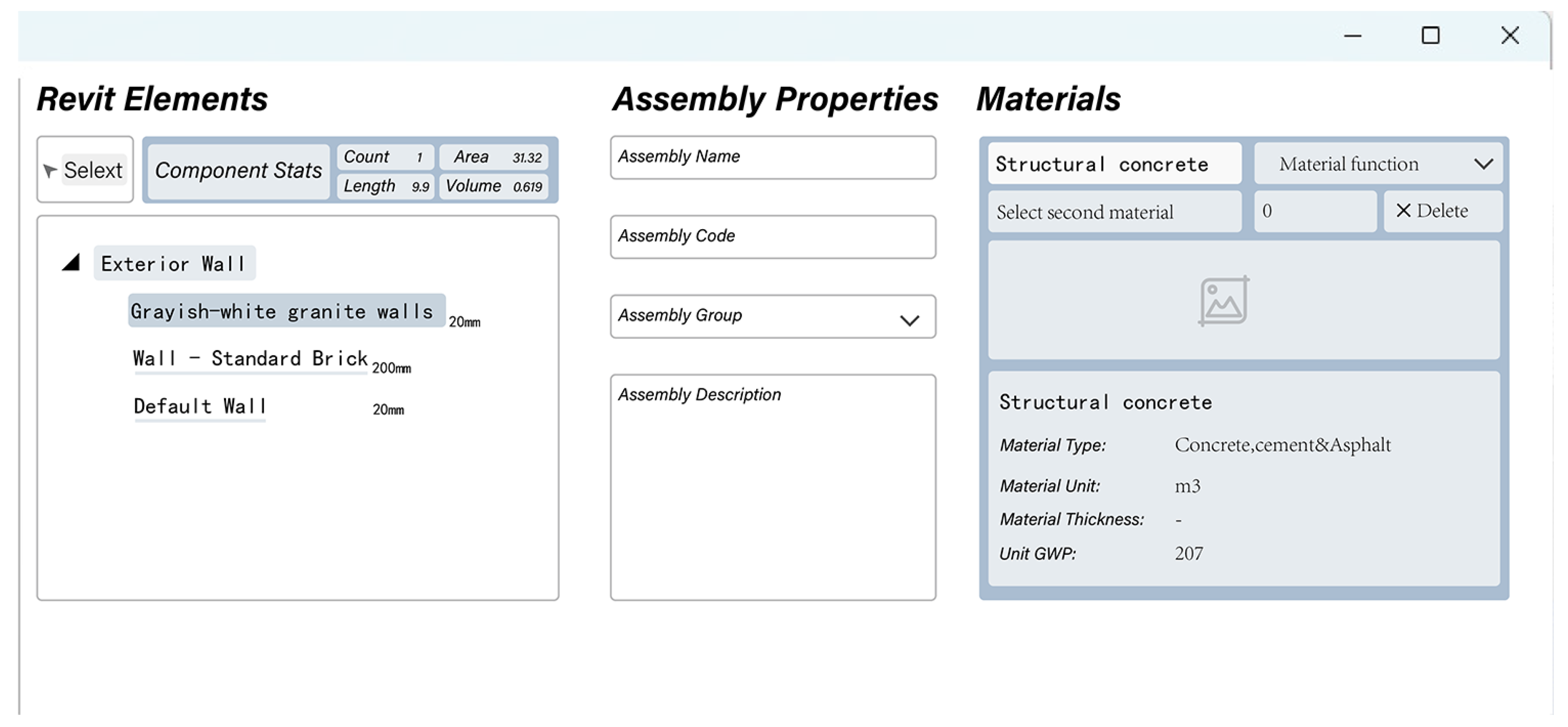 | Material-property fields | Material name, density, thickness | kg, m3, mm | No | Used for emission-intensity calculation and improving result granularity. |