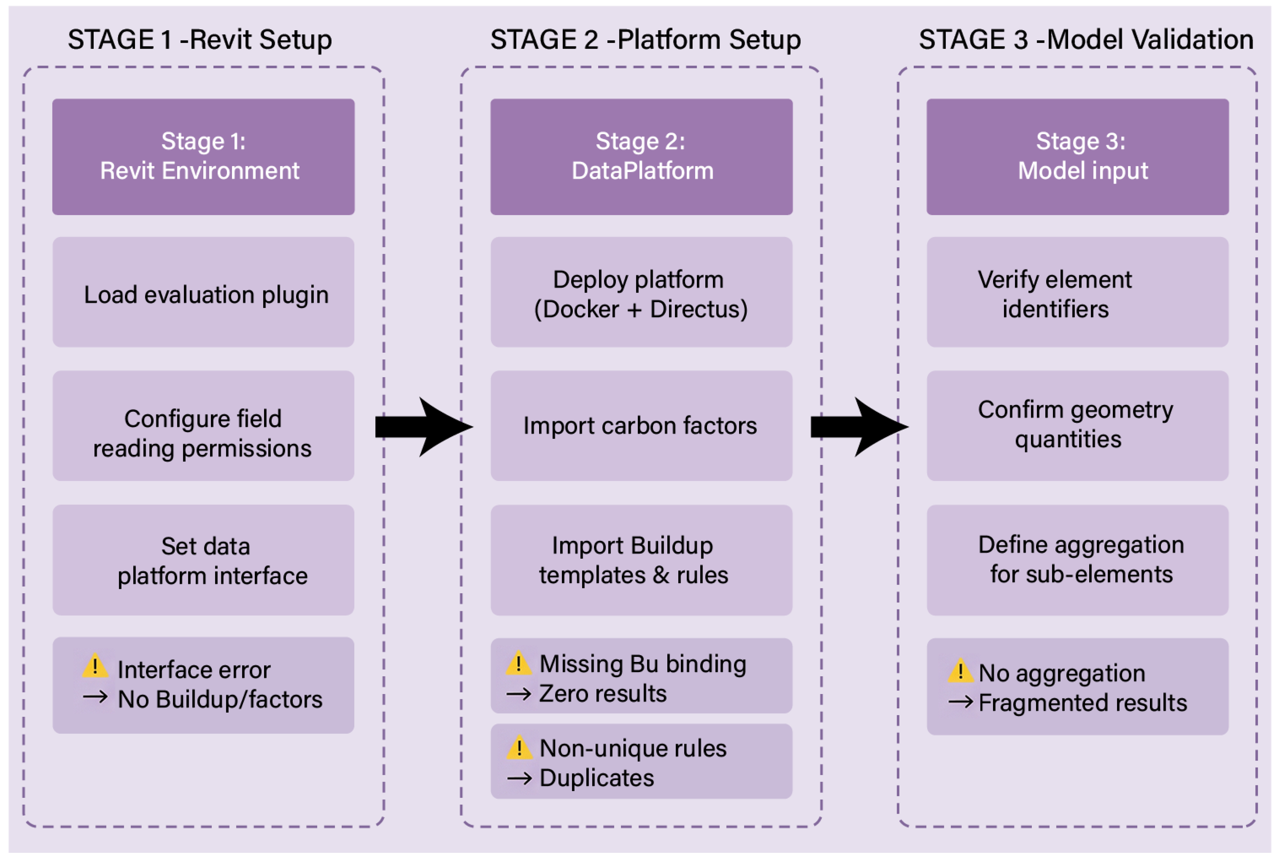 | BoQ | BoQ material inventory LCA data external tools | Export quantities from BIM and perform matching and calculation in an external LCA tool | Low implementation barrier; clear workflow; compatible with conventional quantity takeoff practice | Cross-platform export, cleaning, and matching can easily break the workflow; heavy manual mapping; delayed iterative feedback | [23,24,25] |