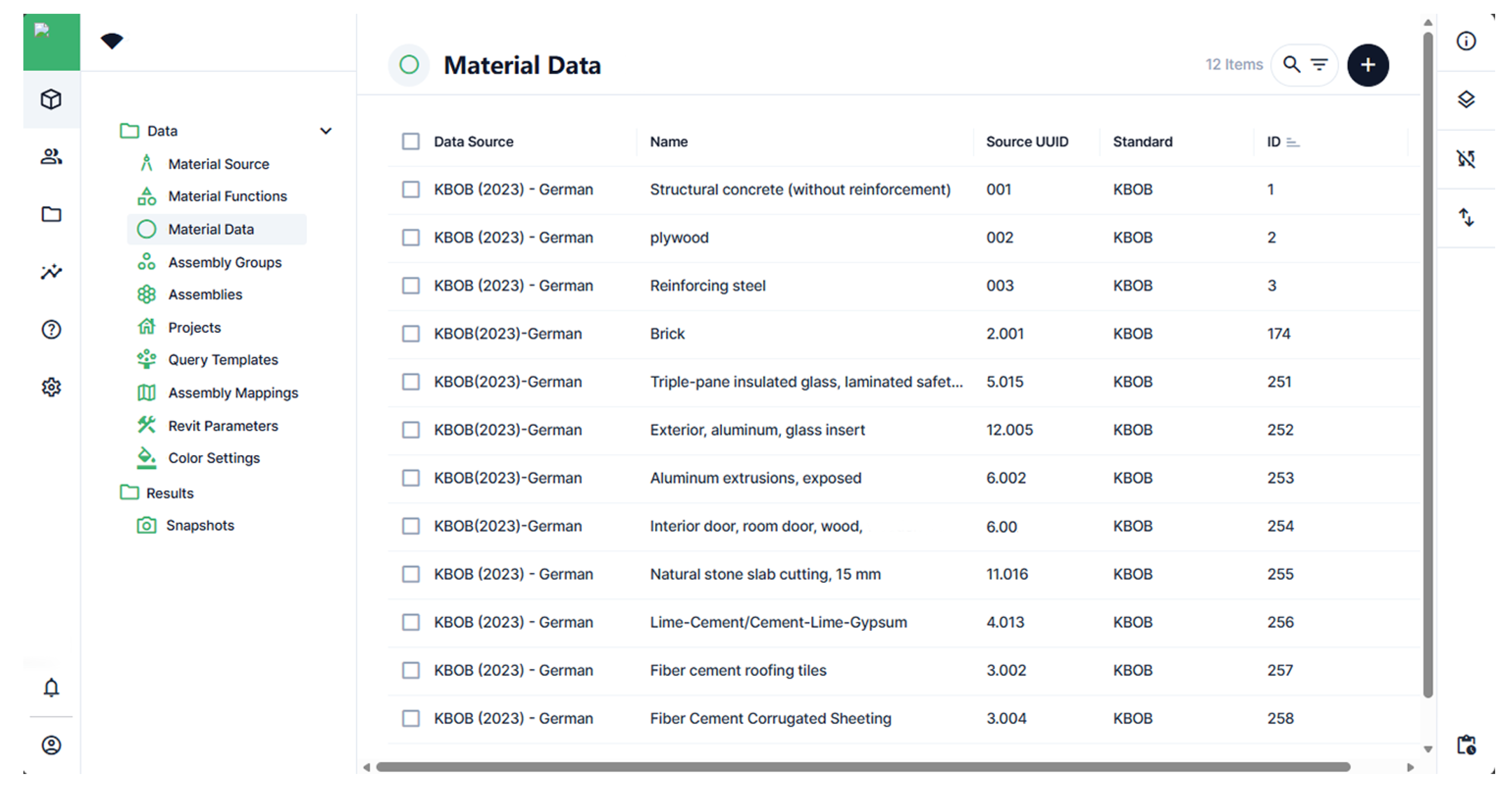 | Structural properties | Thickness Material unit (MU) Category | m kg/m3/m2 (per MU) | No | Defines the measurement basis and supports unit conversion. |