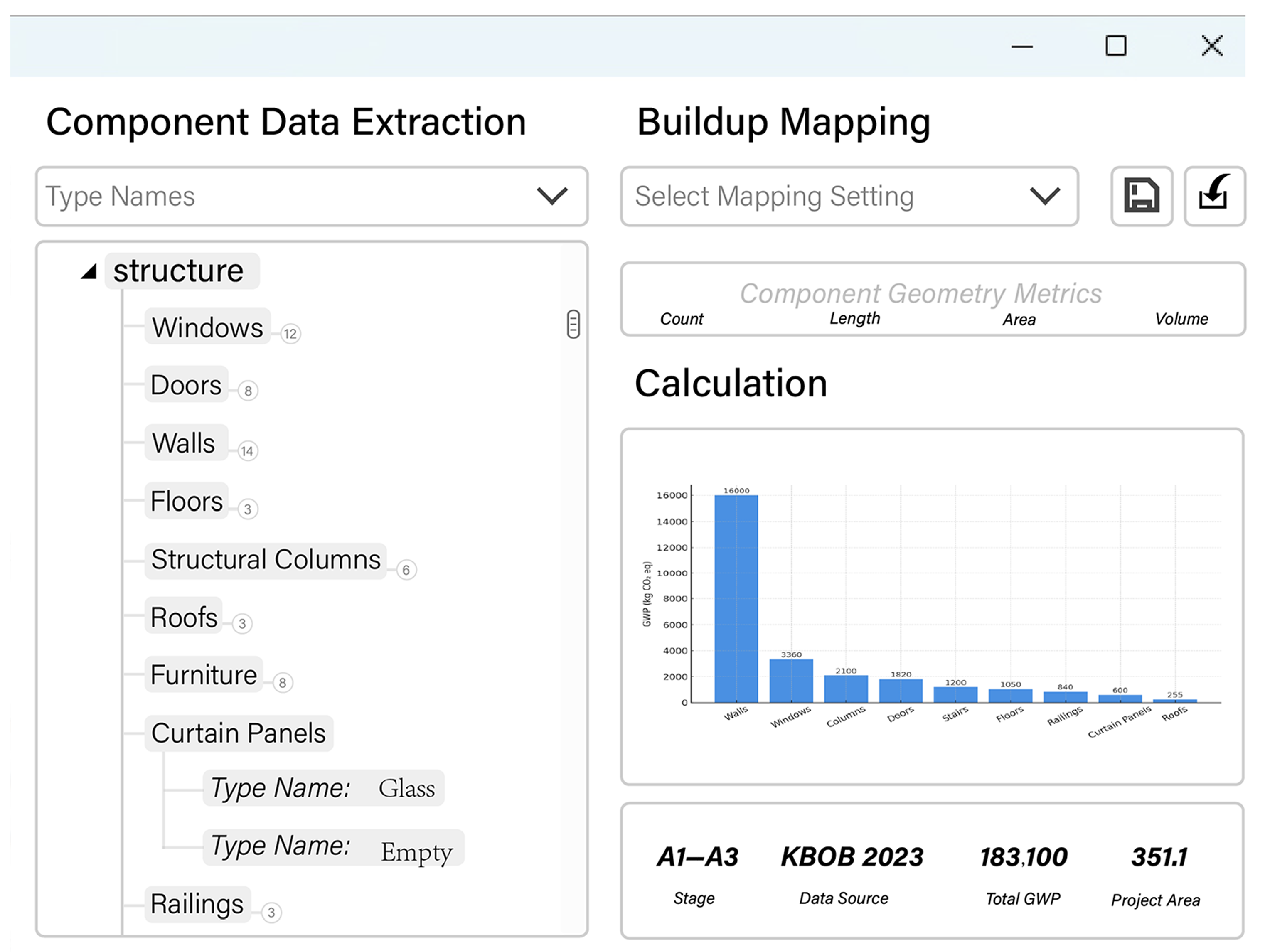 | BIM Viewer | BIM data BIM viewer external tools | Extract and aggregate model data via a viewer or platform and then output environmental indicators | User-friendly visualization and aggregation; convenient for communication and reporting | Indicators are often aggregated; limited capability for component-level refinement and continuous updating | [25,26] |