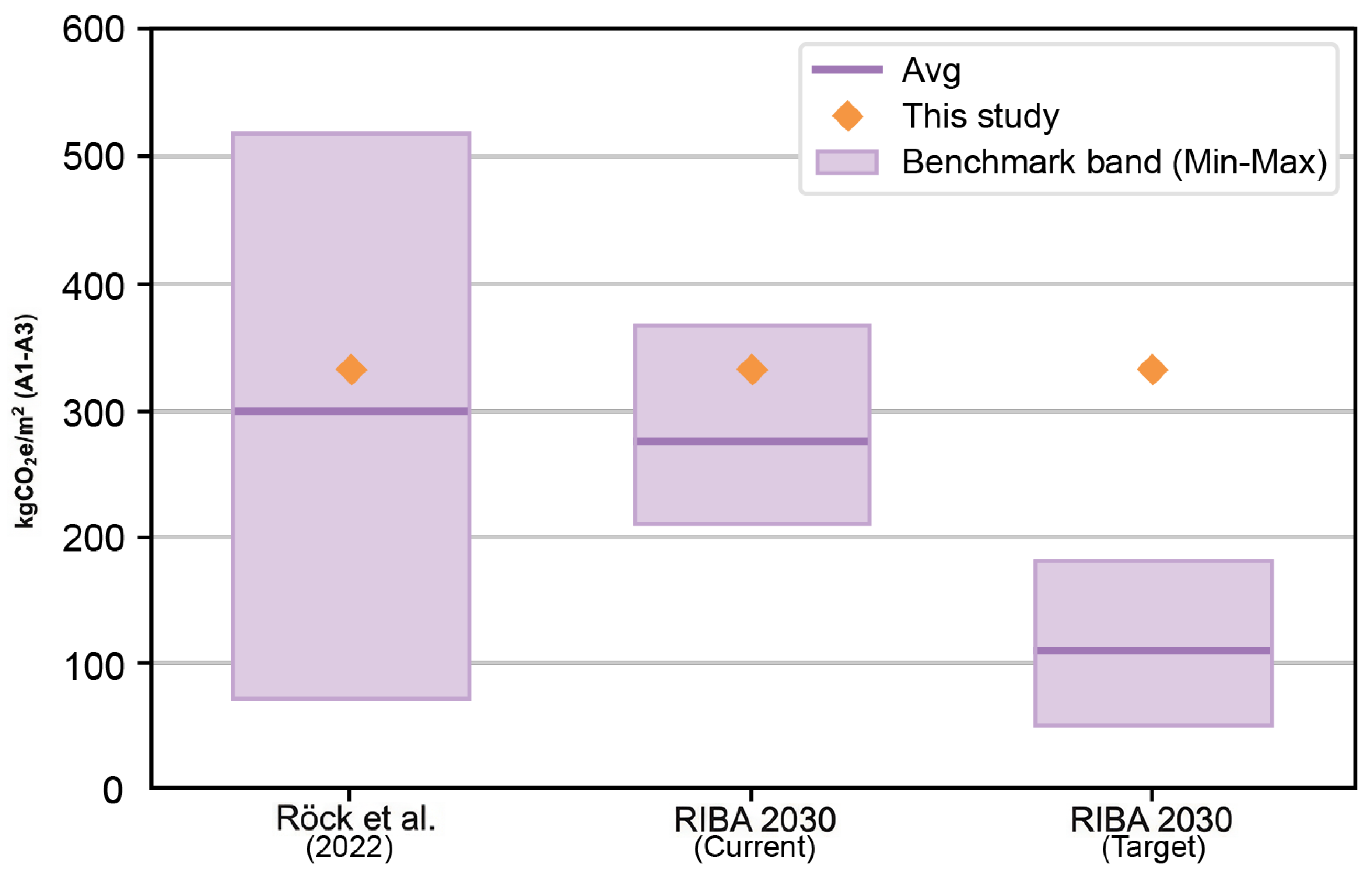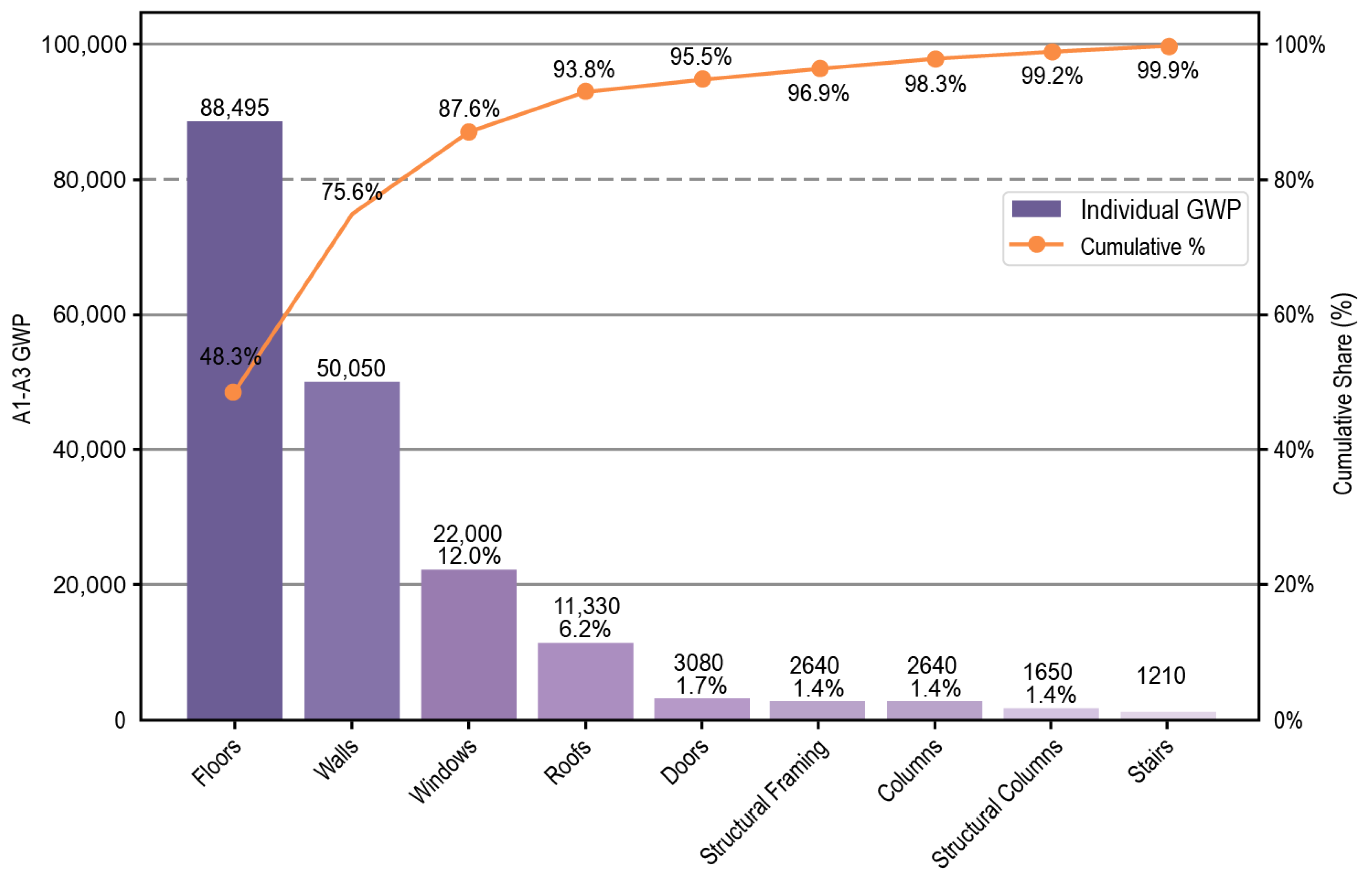 - Under the KBOB (2023) reference factor set and the A1–A3 boundary, the case building yields an area-normalized embodied-carbon intensity of . Decomposition at system, buildup, and material levels shows a concentrated contribution structure and consistent traceability across aggregation levels, supporting result checking and hotspot localization.
