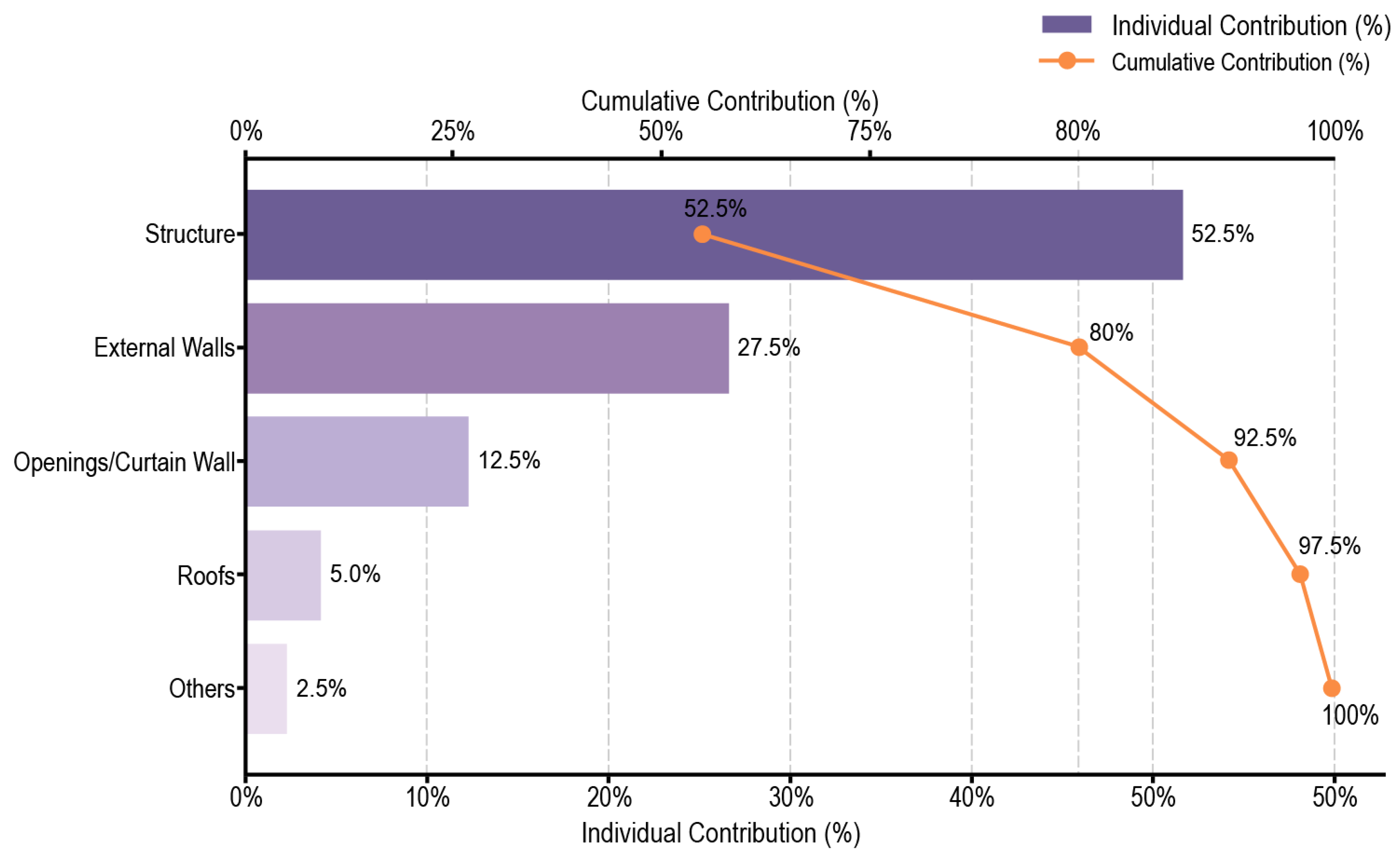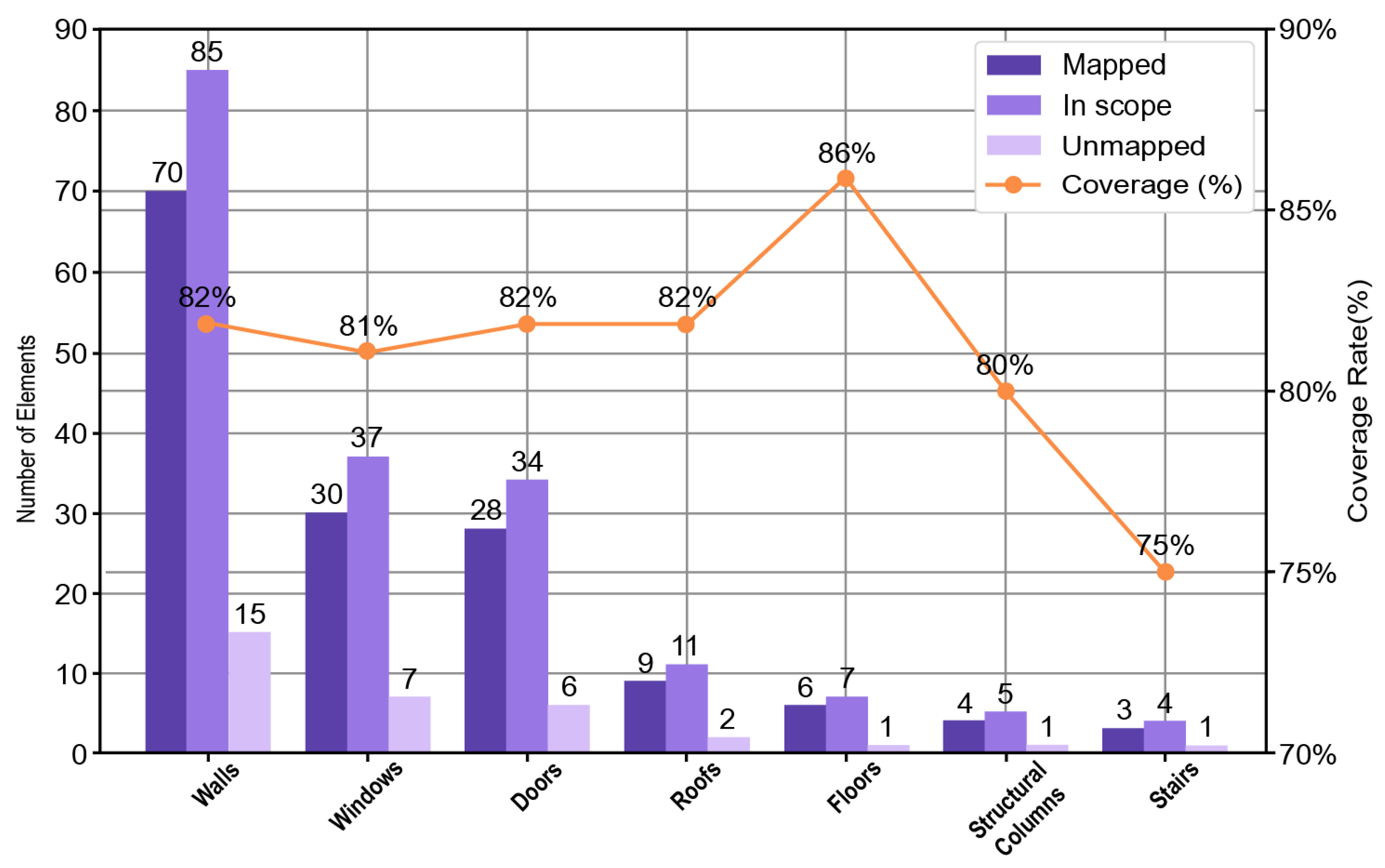 - Mapping coverage reaches approximately 82%. Most components complete the closed chain of “mapping–quantity retrieval–factor invocation”. Uncovered items are mainly linked to rule/template completeness, quantity-retrieval field availability, identification-field consistency, and factor-entry validity. This quantifies the current automation boundary and identifies knowledge-base constraints for subsequent completion and governance. The carbon weight of uncovered items is not quantified here; hotspot identification is therefore conditional on the mapped subset.
