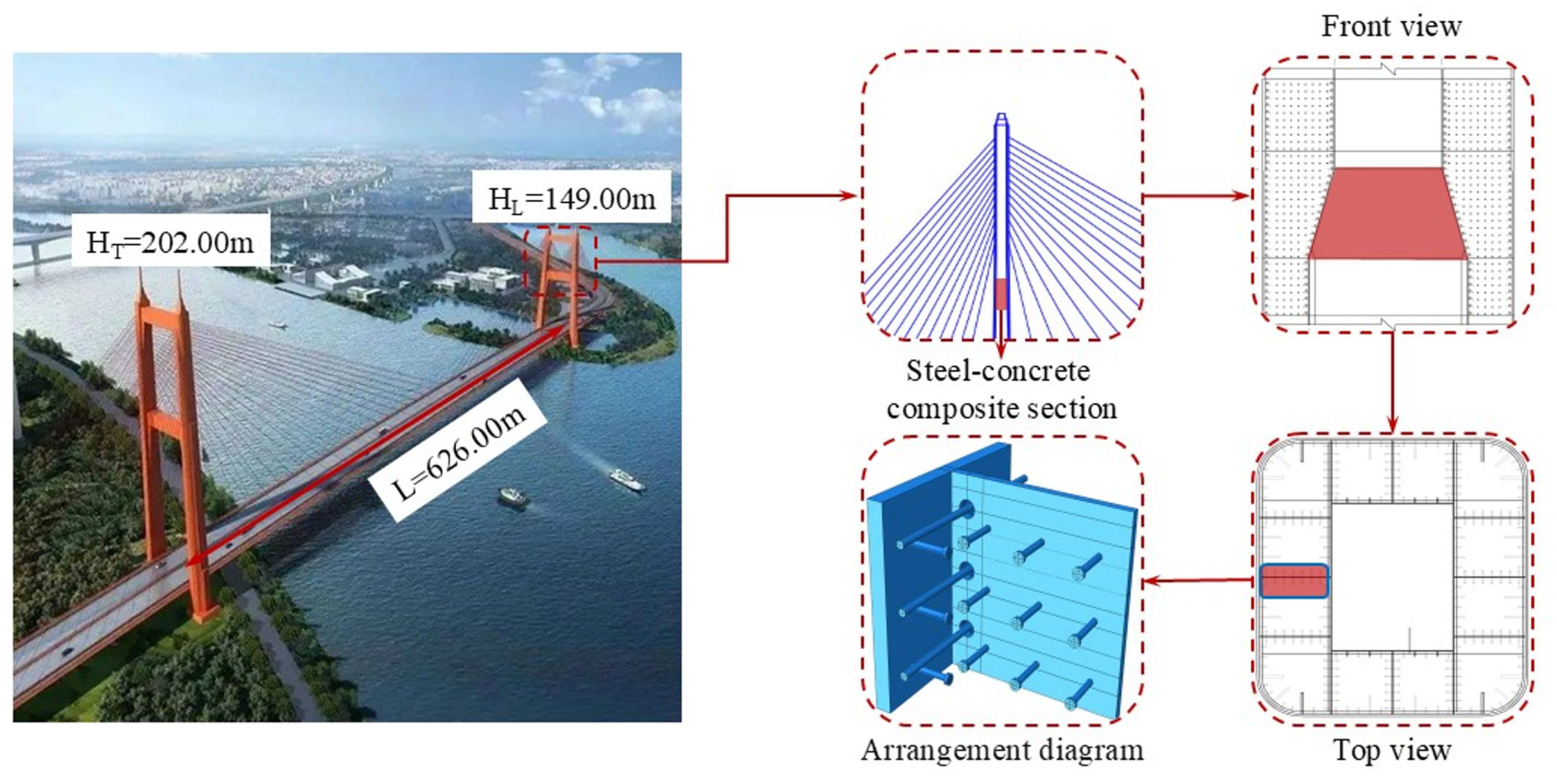 - Du, Y.; Wang, R.; Zhen, X.; Ma, N. Calculation of elastic stiffness for shear connectors in steel-concrete composite bridge tower joints. J. South China Univ. Technol. Nat. Sci. Ed. 2023, 51, 76–87. [Google Scholar]