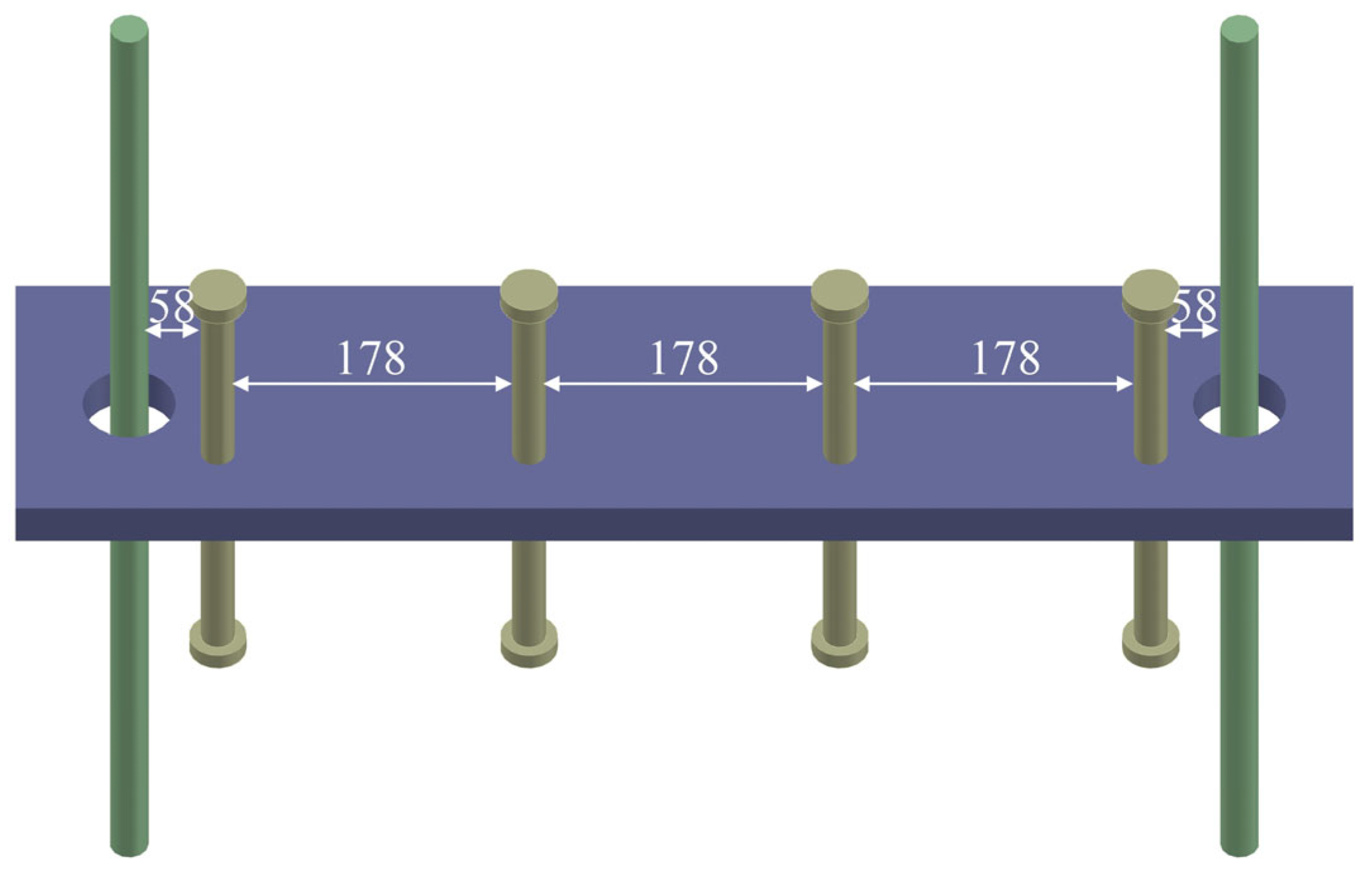 - Fang, Z.C.; Jiang, H.B.; Chen, G.F.; Dong, X.T.; Shao, T.F. Behavior of grouped stud shear connectors between precast high-strength concrete slabs and steel beams. Steel Compos. Struct. Int. J. 2020, 34, 837–851. [Google Scholar]
