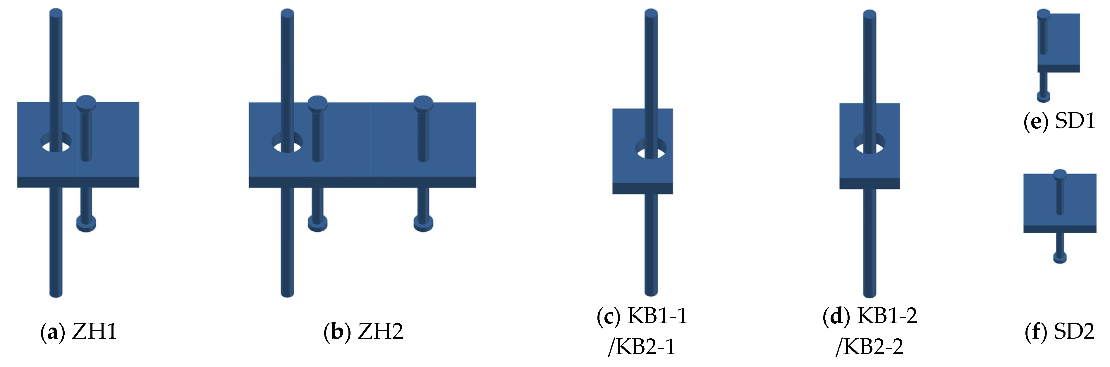 - Ma, Y.; Zhou, B.; Wang, L.; Zhang, J. Experimental study on shear behavior and bearing capacity calculation of pressure-bearing composite shear keys. Eng. Mech. 2023, 40, 120–129. [Google Scholar]
