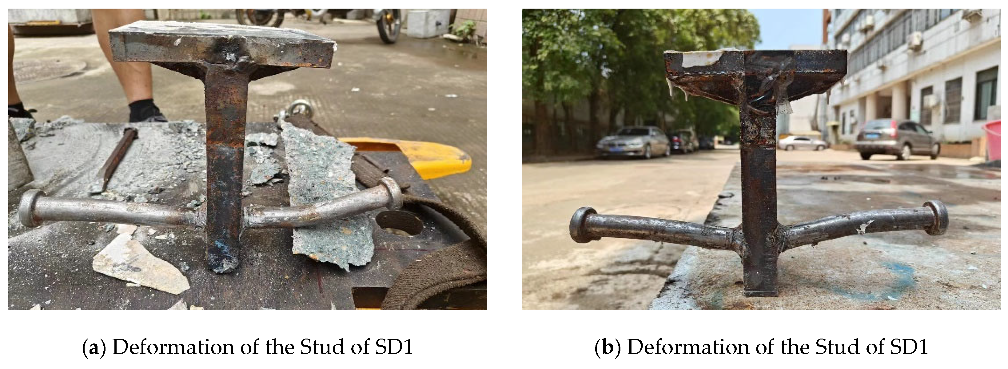 - Kuang, Y.; Chen, L.; Li, C.; He, Y. Mechanical performance analysis of stud shear connectors. J. Jilin Univ. Eng. Technol. Ed. 2023, 53, 5385–5446. [Google Scholar] [CrossRef]
