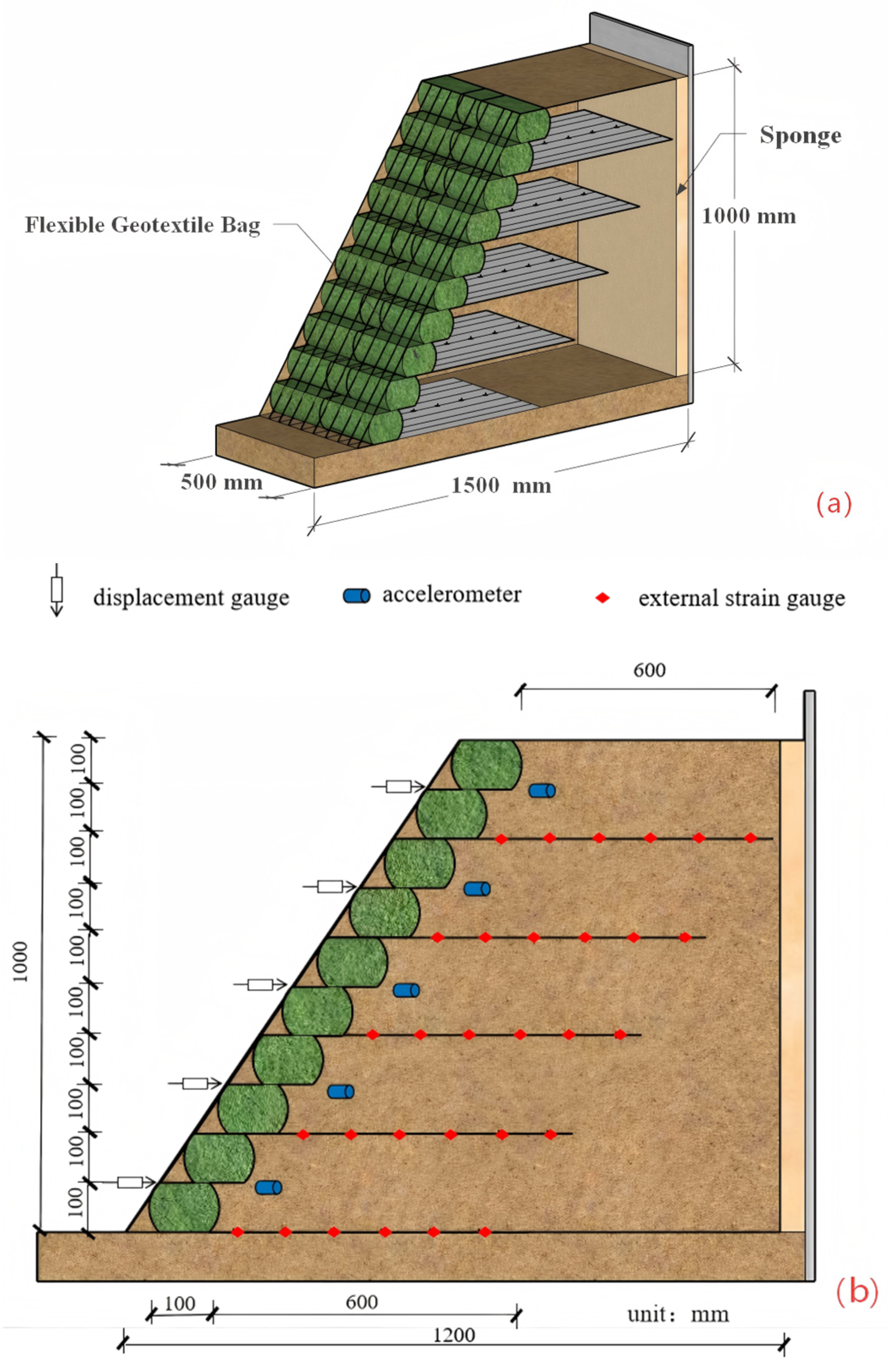 - Meng, Y.; Xu, C.; Yang, Y.; Li, G.; Wei, X.; Jia, B. Seismic performance of reinforced soil slopes with gabions and geobags as slope facings in shaking table test. Soil Dyn. Earthq. Eng. 2025, 198, 109645. [Google Scholar] [CrossRef]