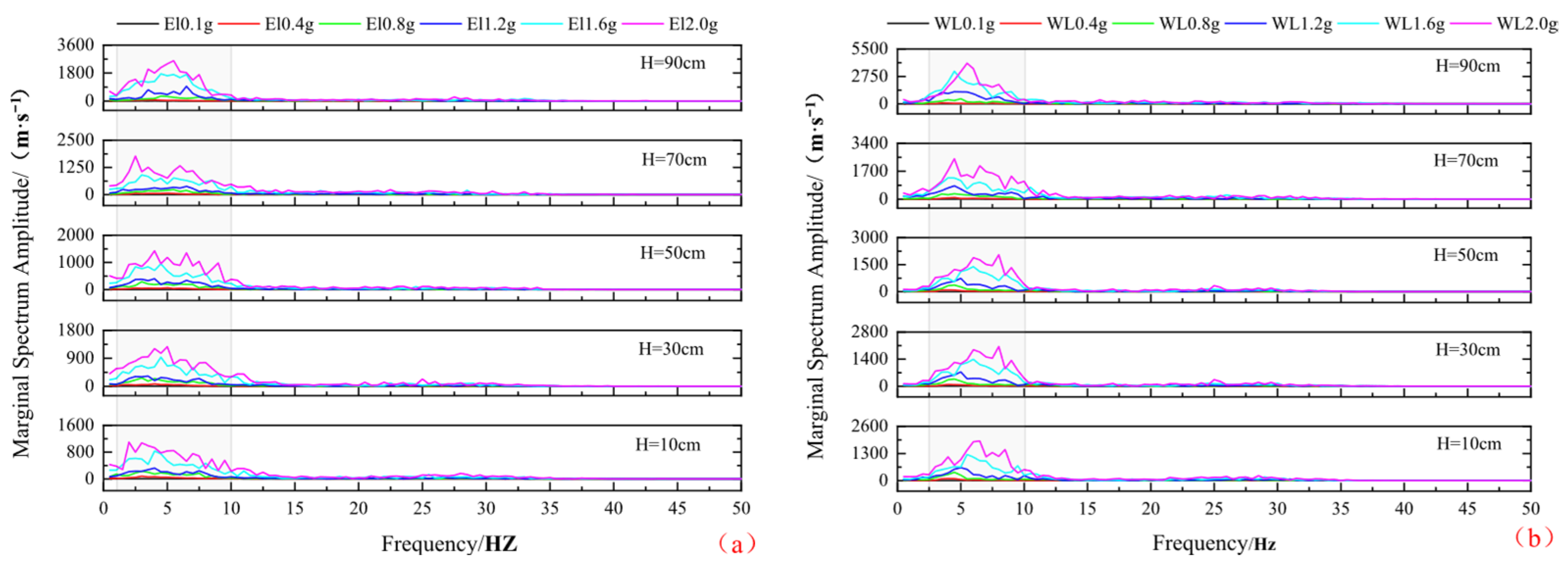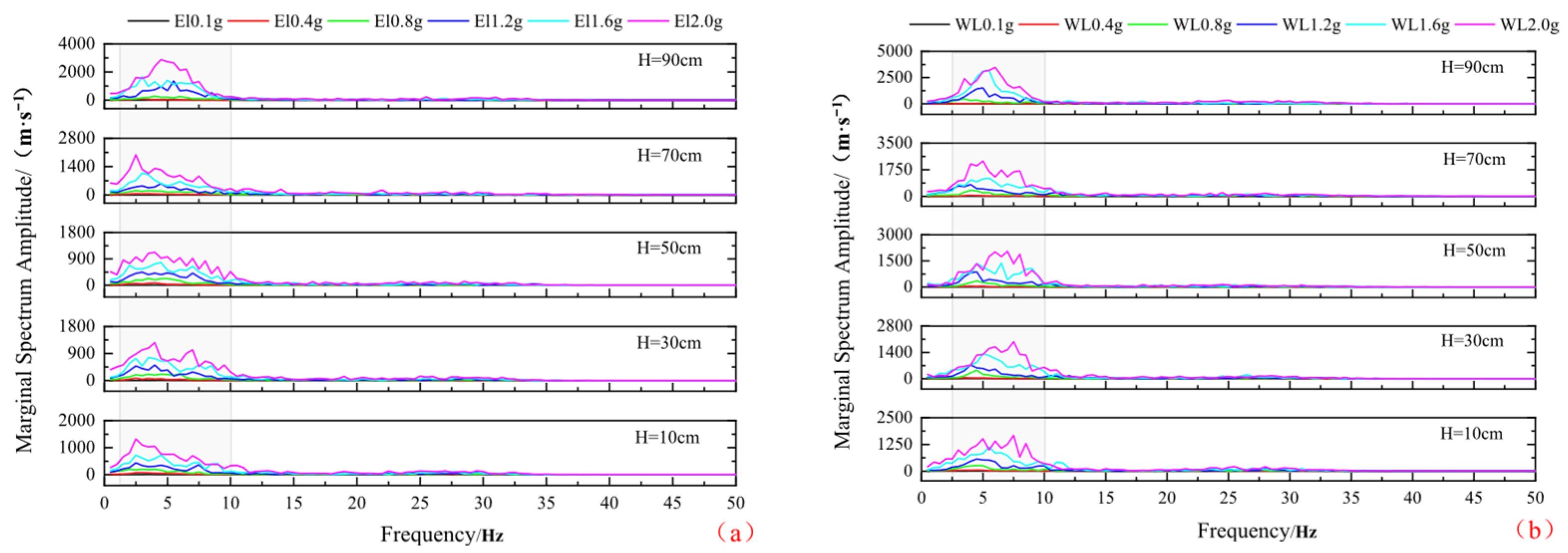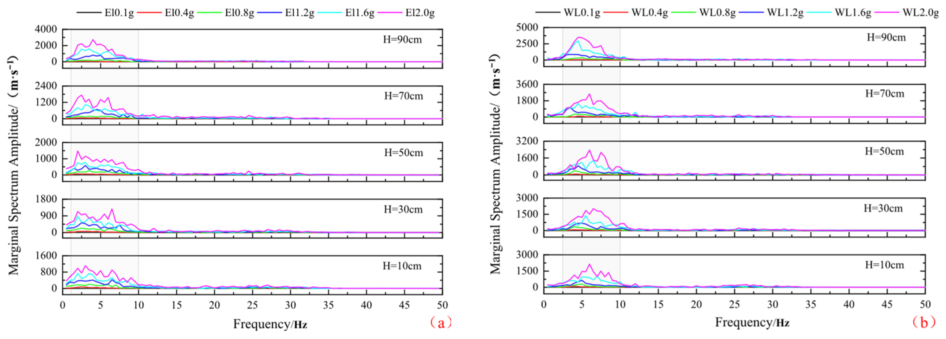 - Marginal spectrum analysis indicated that the energy under El wave and WL wave excitations was primarily concentrated in the frequency ranges of 1–10 Hz and 2.5–10 Hz, respectively. Significant damage initiated in the mid-upper part of the slope, and the damage location was closely related to the facing type: damage in the C-shaped facing started inside the slope body, demonstrating good integrity; the secondary-reinforcement facing showed an abrupt change in marginal spectral amplitude near the slope crest, indicating weaker constraint and a tendency for local loosening; the self-wrap facing exhibited a sharp increase in spectral amplitude near the crest, consistent with the observed strain characteristic that the top reinforcement layer is prone to pull-out.