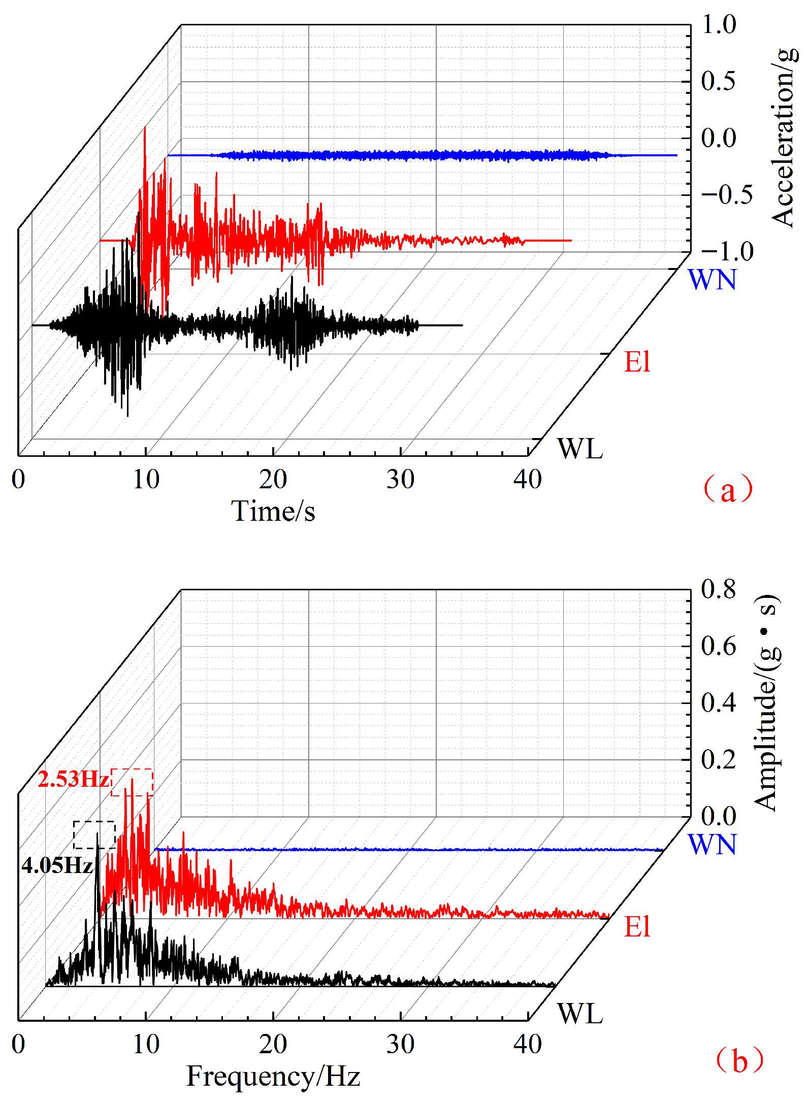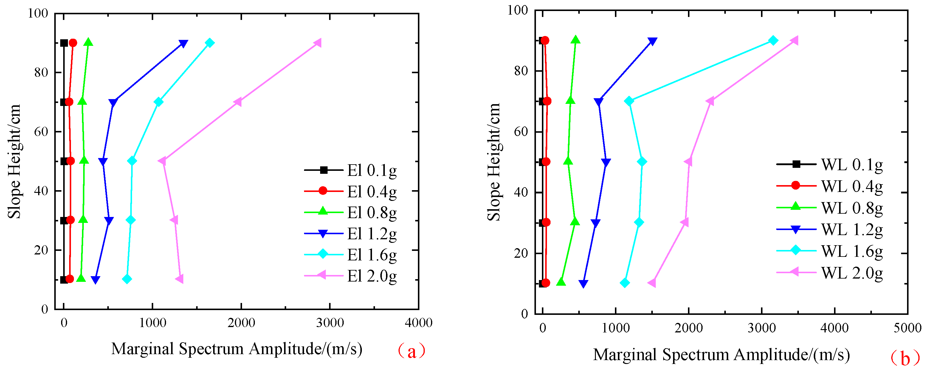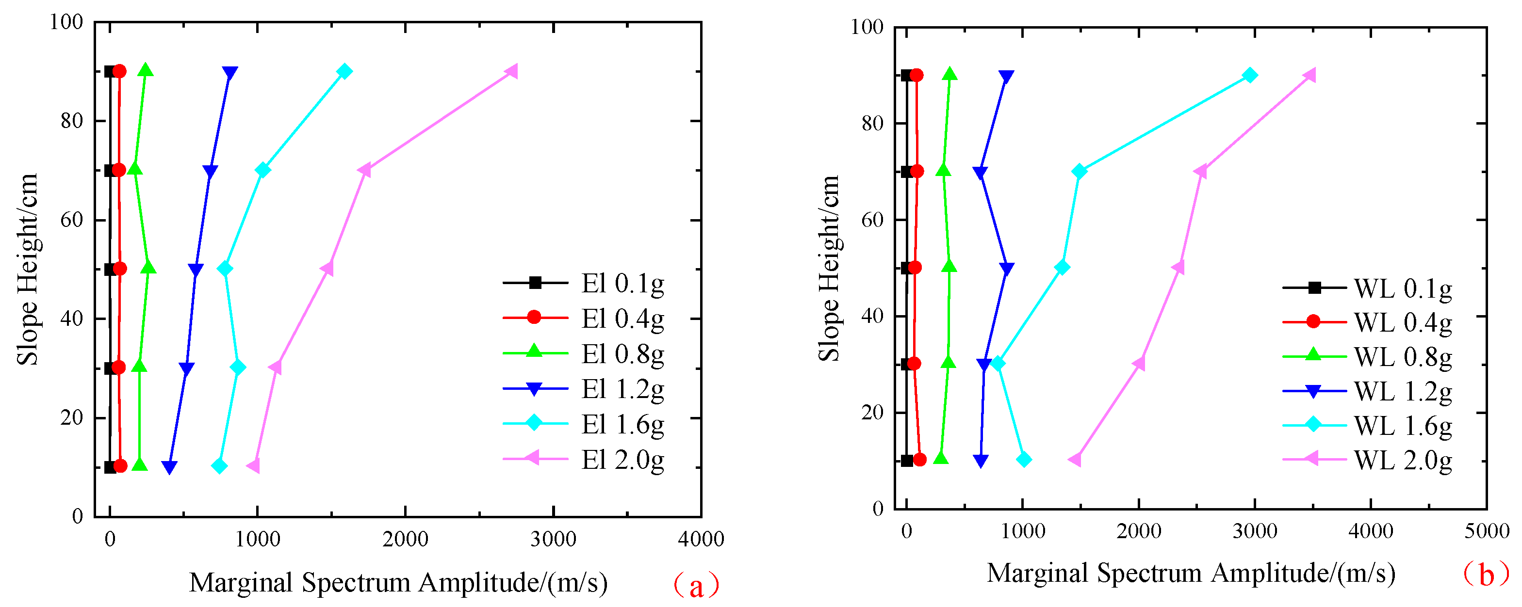 - Marginal spectrum analysis indicated that the energy under El wave and WL wave excitations was primarily concentrated in the frequency ranges of 1–10 Hz and 2.5–10 Hz, respectively. Significant damage initiated in the mid-upper part of the slope, and the damage location was closely related to the facing type: damage in the C-shaped facing started inside the slope body, demonstrating good integrity; the secondary-reinforcement facing showed an abrupt change in marginal spectral amplitude near the slope crest, indicating weaker constraint and a tendency for local loosening; the self-wrap facing exhibited a sharp increase in spectral amplitude near the crest, consistent with the observed strain characteristic that the top reinforcement layer is prone to pull-out.