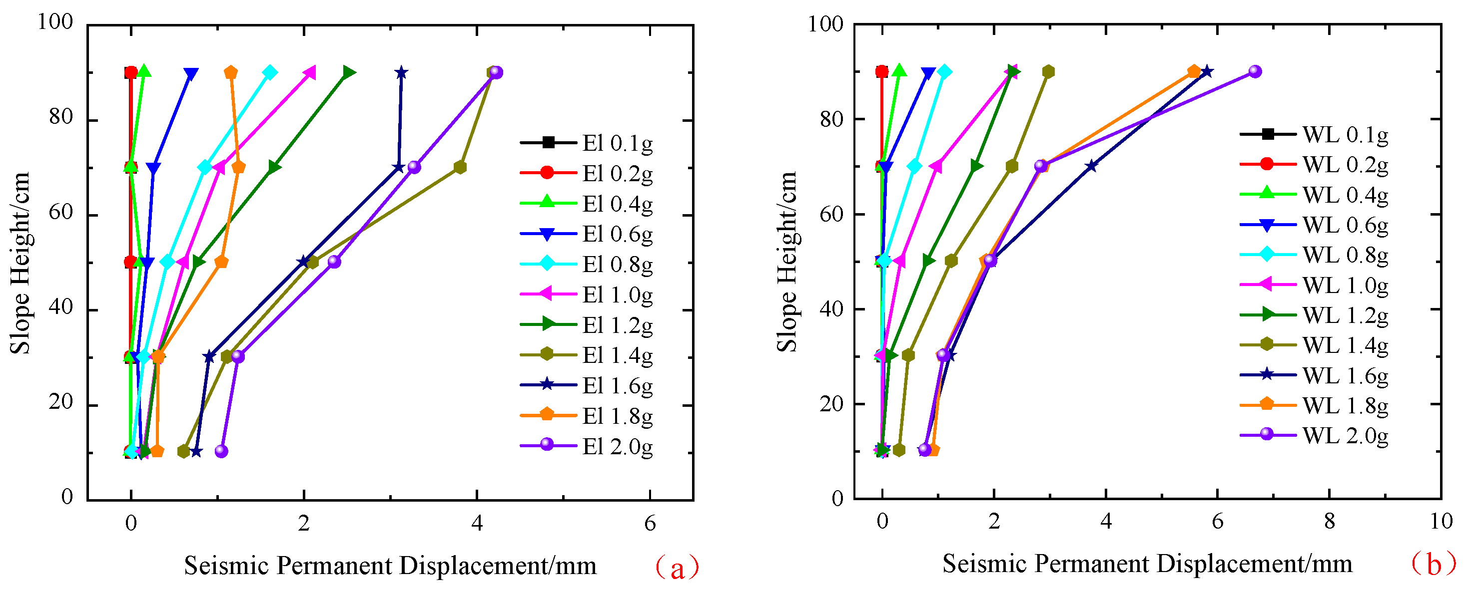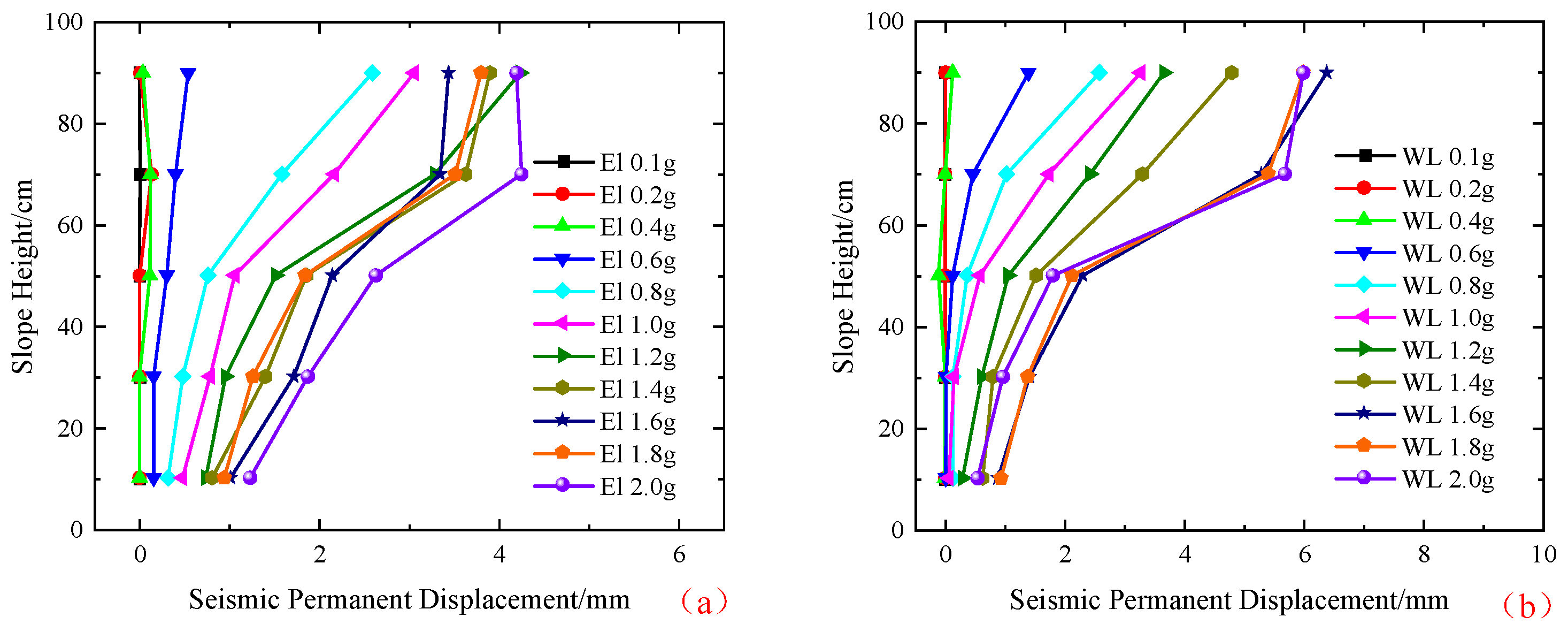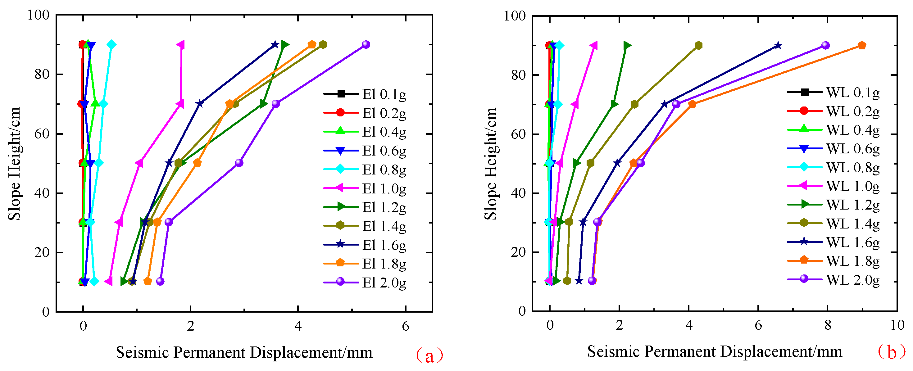 - The permanent seismic displacement of the slope face in a reinforced loess slope is influenced by the PGA. Significant displacement commenced for C-shaped wrap-around facing under the 1.0 g PGA condition, whereas for the secondary-reinforcement and self-wrap facing types, it initiated under the 0.8 g PGA condition. The total permanent seismic displacement exhibited a nonlinear increase with increasing dynamic loading. The displacement magnitudes observed under WL wave excitation were generally greater than those produced under El wave excitation.