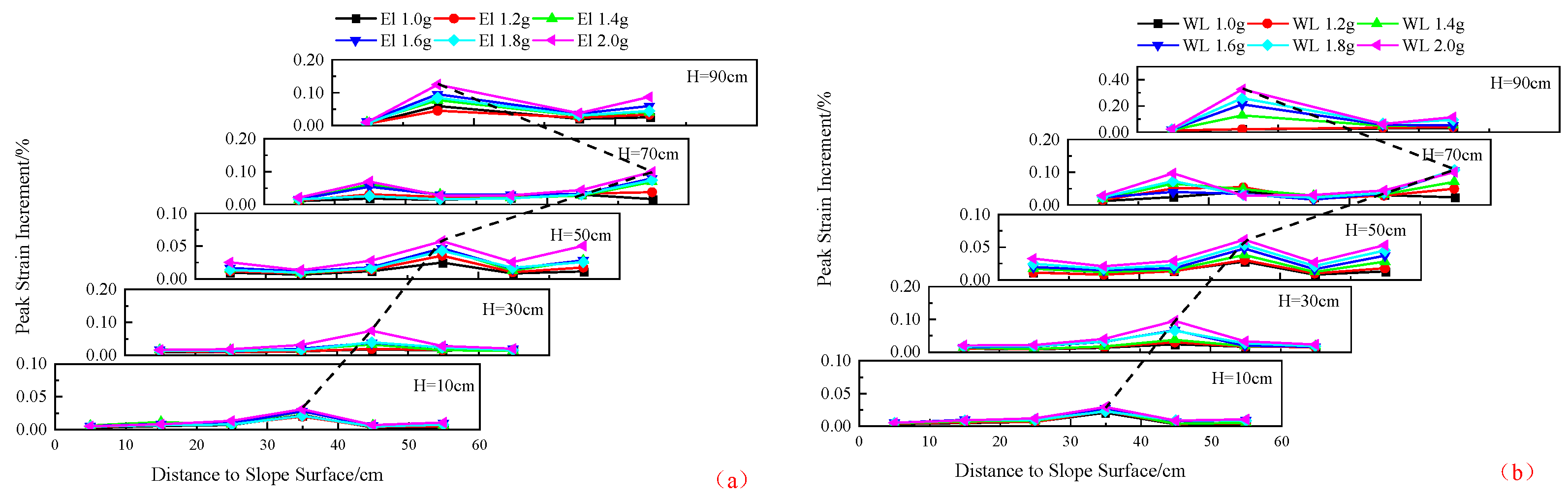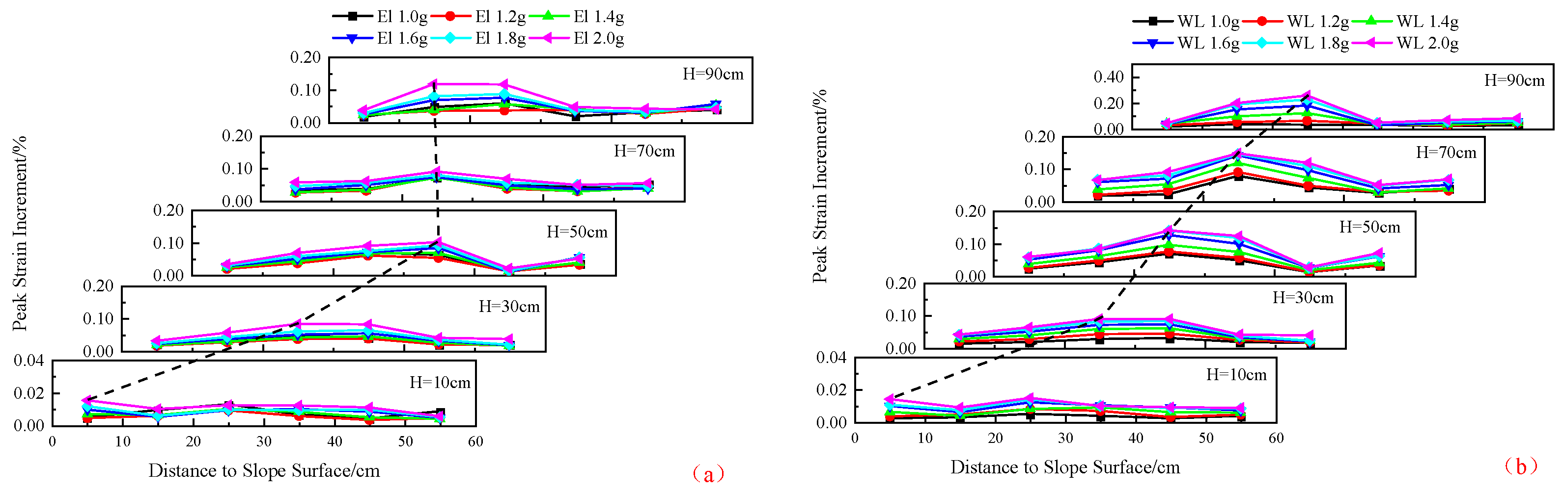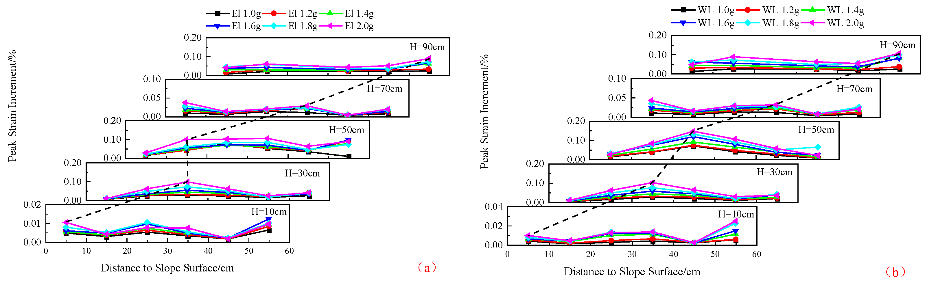 - The permanent seismic displacement of the slope face in a reinforced loess slope is influenced by the PGA. Significant displacement commenced for C-shaped wrap-around facing under the 1.0 g PGA condition, whereas for the secondary-reinforcement and self-wrap facing types, it initiated under the 0.8 g PGA condition. The total permanent seismic displacement exhibited a nonlinear increase with increasing dynamic loading. The displacement magnitudes observed under WL wave excitation were generally greater than those produced under El wave excitation.