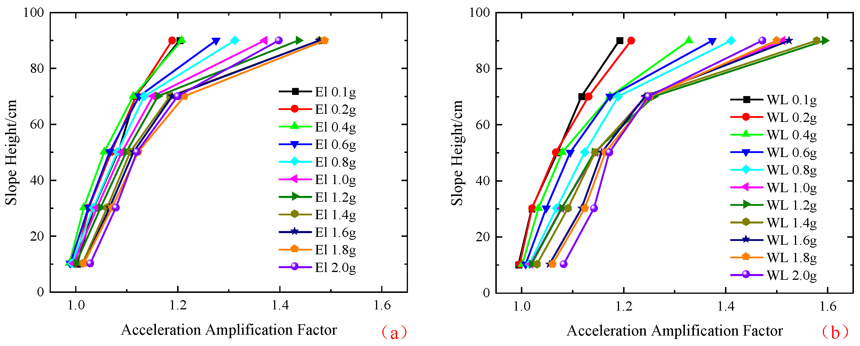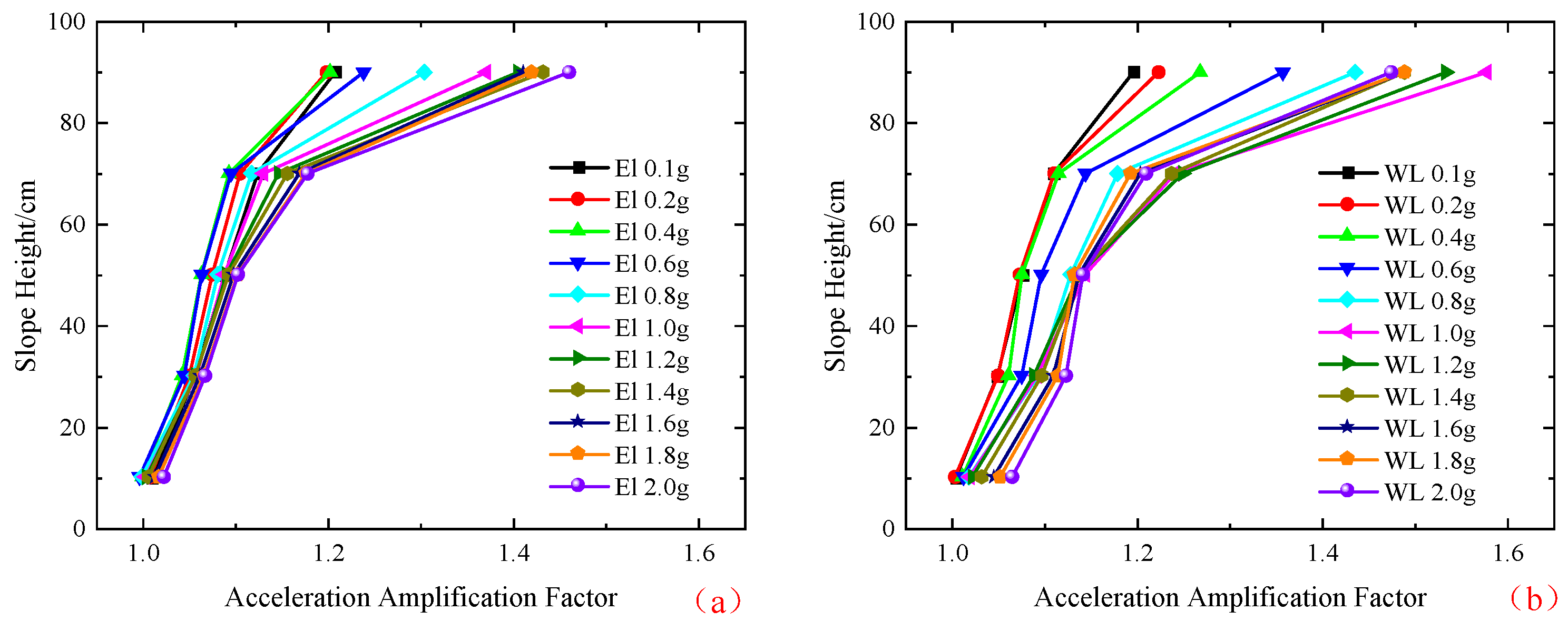 - The acceleration amplification factor increased nonlinearly along the slope height, reaching its maximum at the crest. As the PGA increased, the amplification factor first increased and then decreased, with an earlier decrease under WL wave excitation. The C-shaped facing exhibited the best structural integrity and the most effective control of acceleration response.