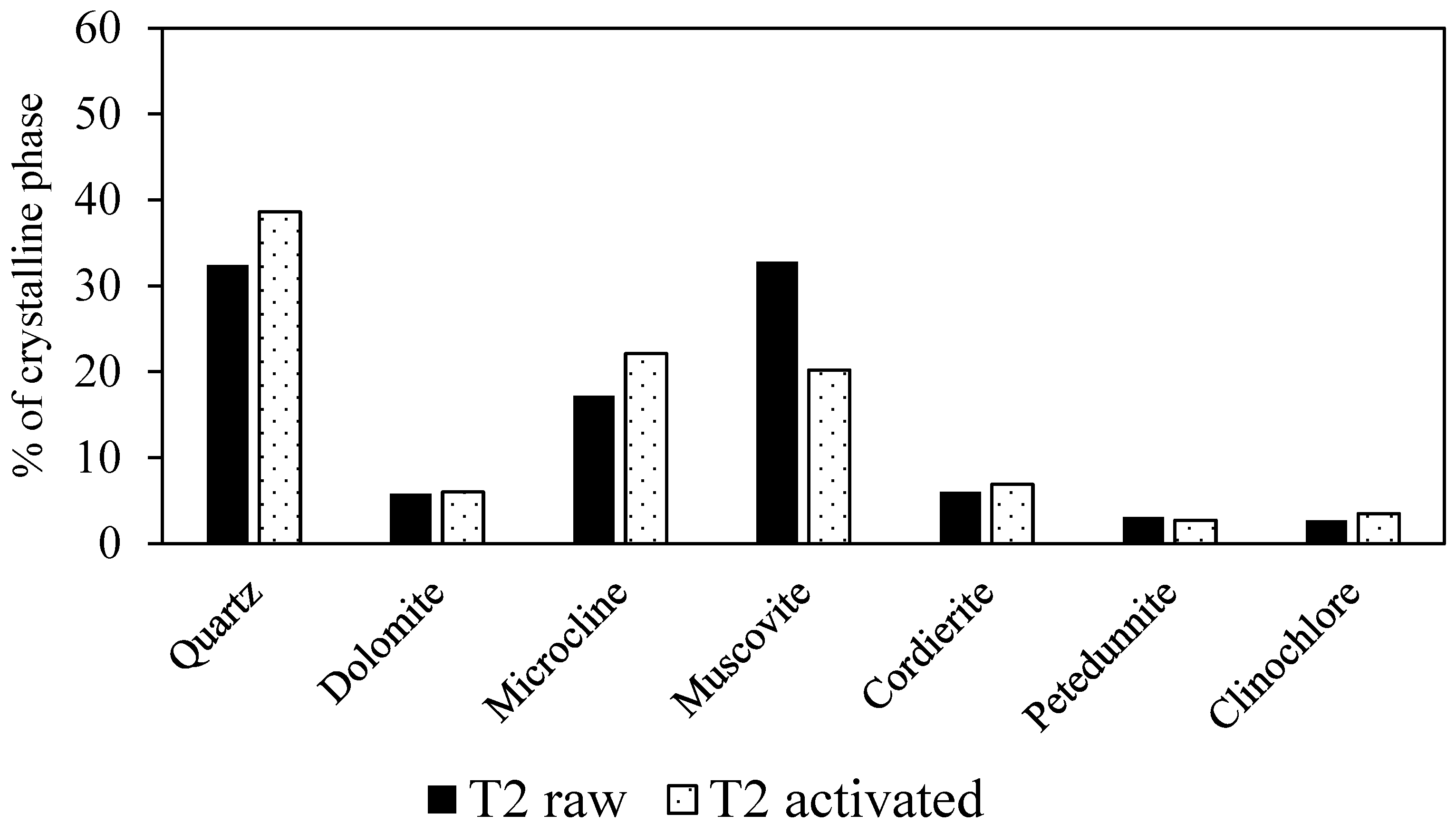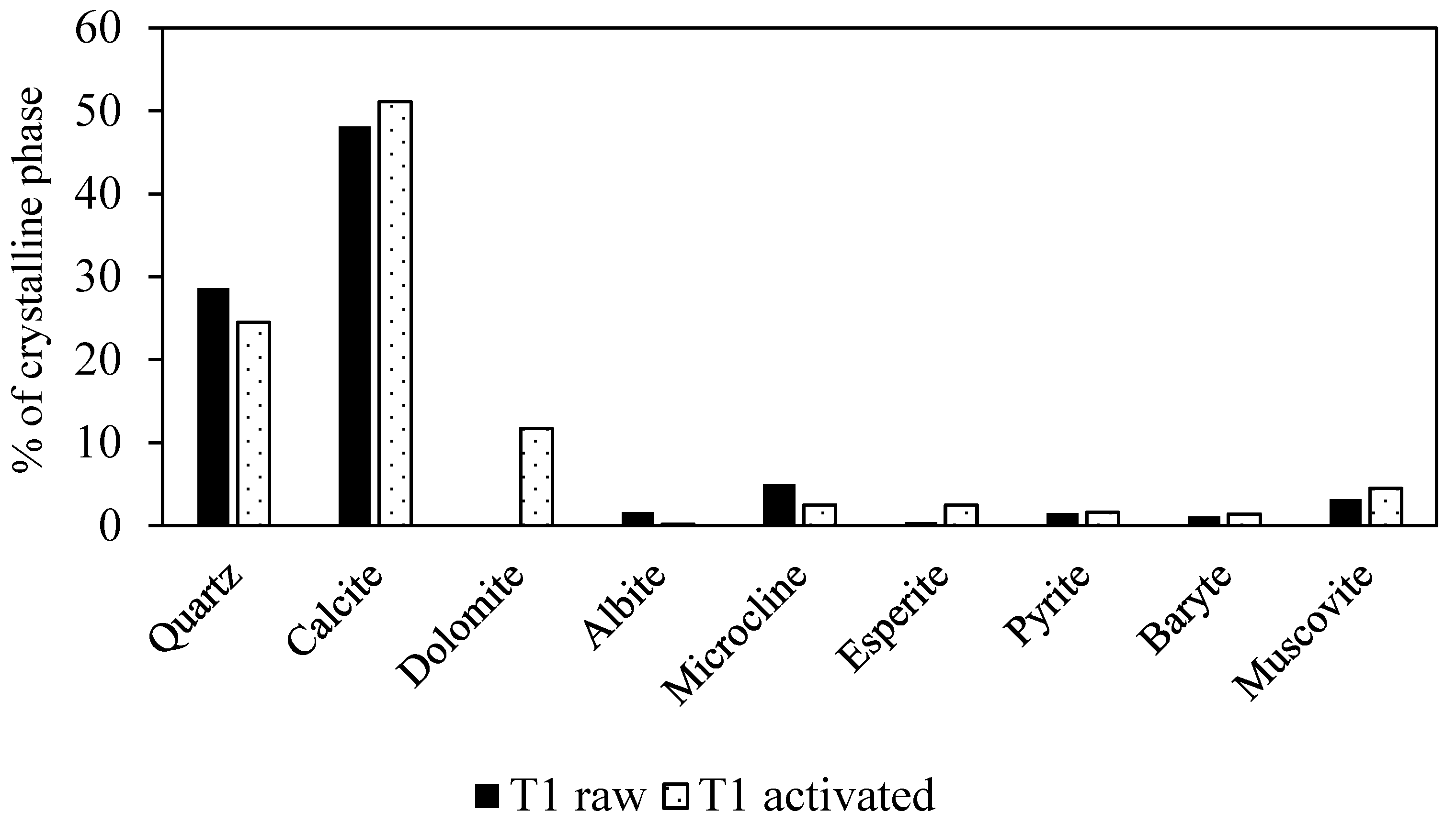 - Mechanical activation for 6 min in a vibratory cup mill reduced the particle size of the tailings and decreased the amount of crystalline muscovite, microcline, and albite in the tailings. The reduction in particle size and crystallinity was not complete, indicating potential for further optimization of the activation process.