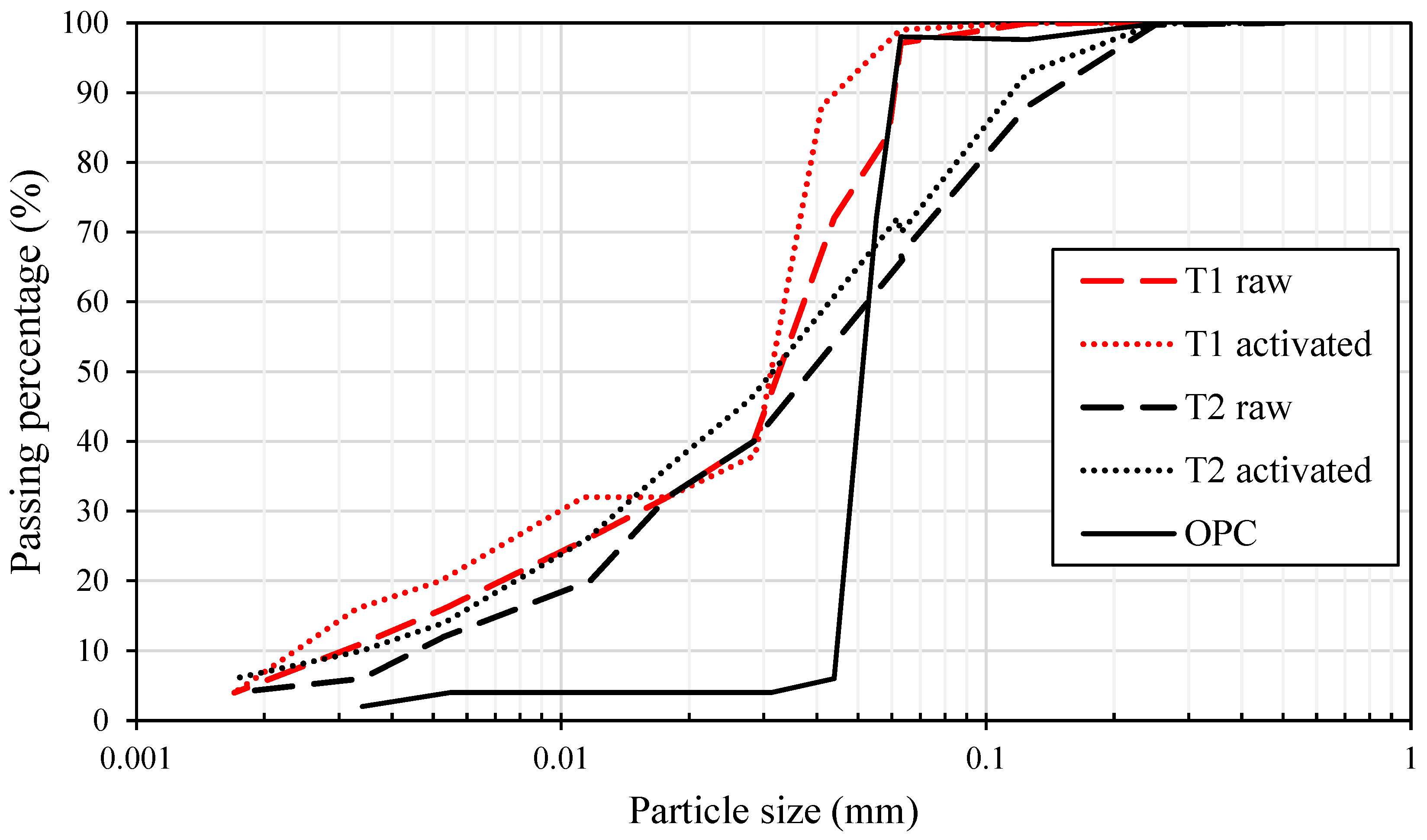 | Mix | Portland Cement | T1 Raw | T1 Activated | T2 Raw | T2 Activated | Natural Sand | Water |