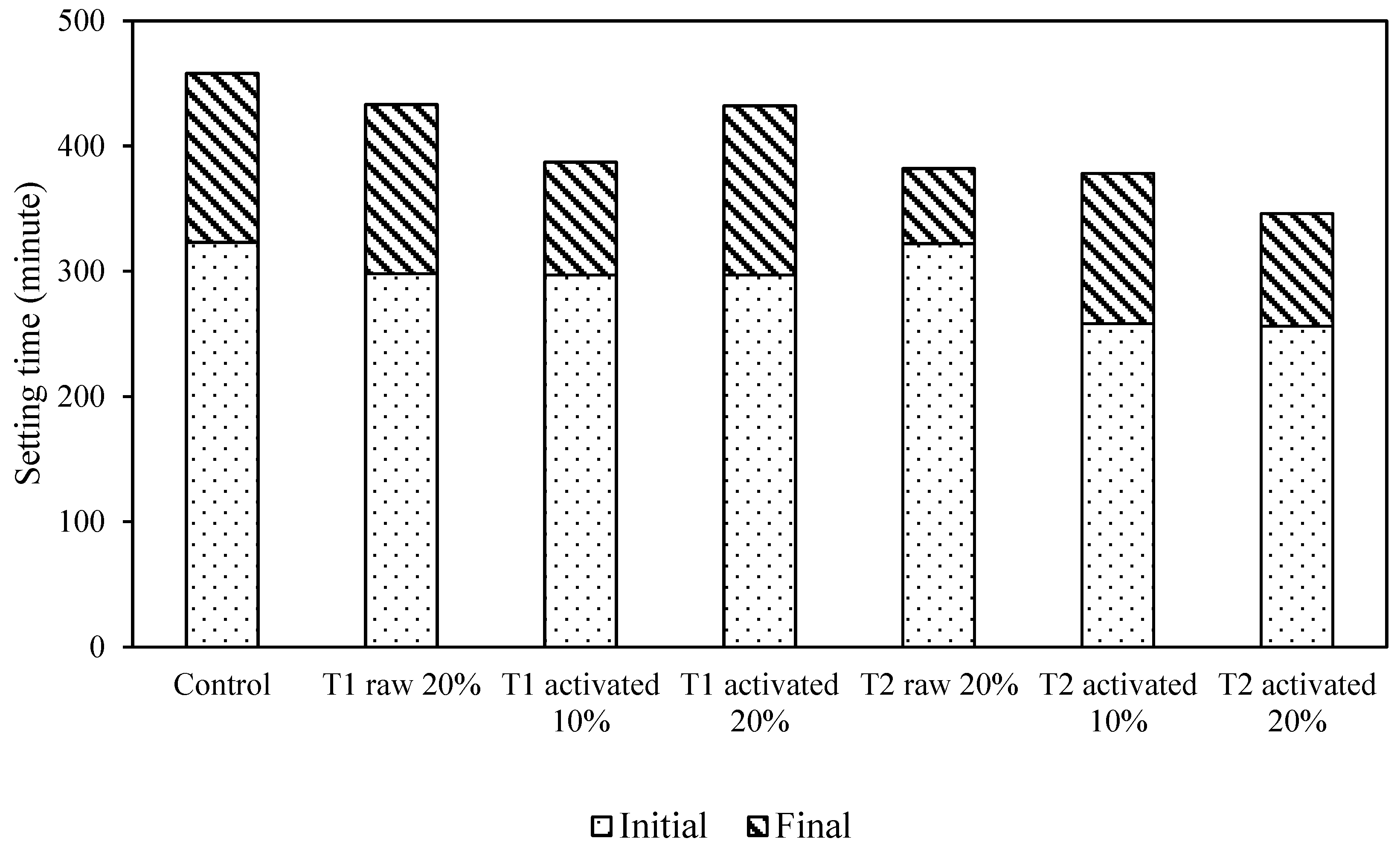 - Initial and final setting times of the mortars were shortened by up to 21% and 25%, respectively, when replacing 10–20% of OPC with lead–zinc tailings, primarily due to water adsorption on particle surfaces. This effect was more pronounced for T2, showing that activation of tailings influences the fresh properties and decreases the workable time of the mortars.