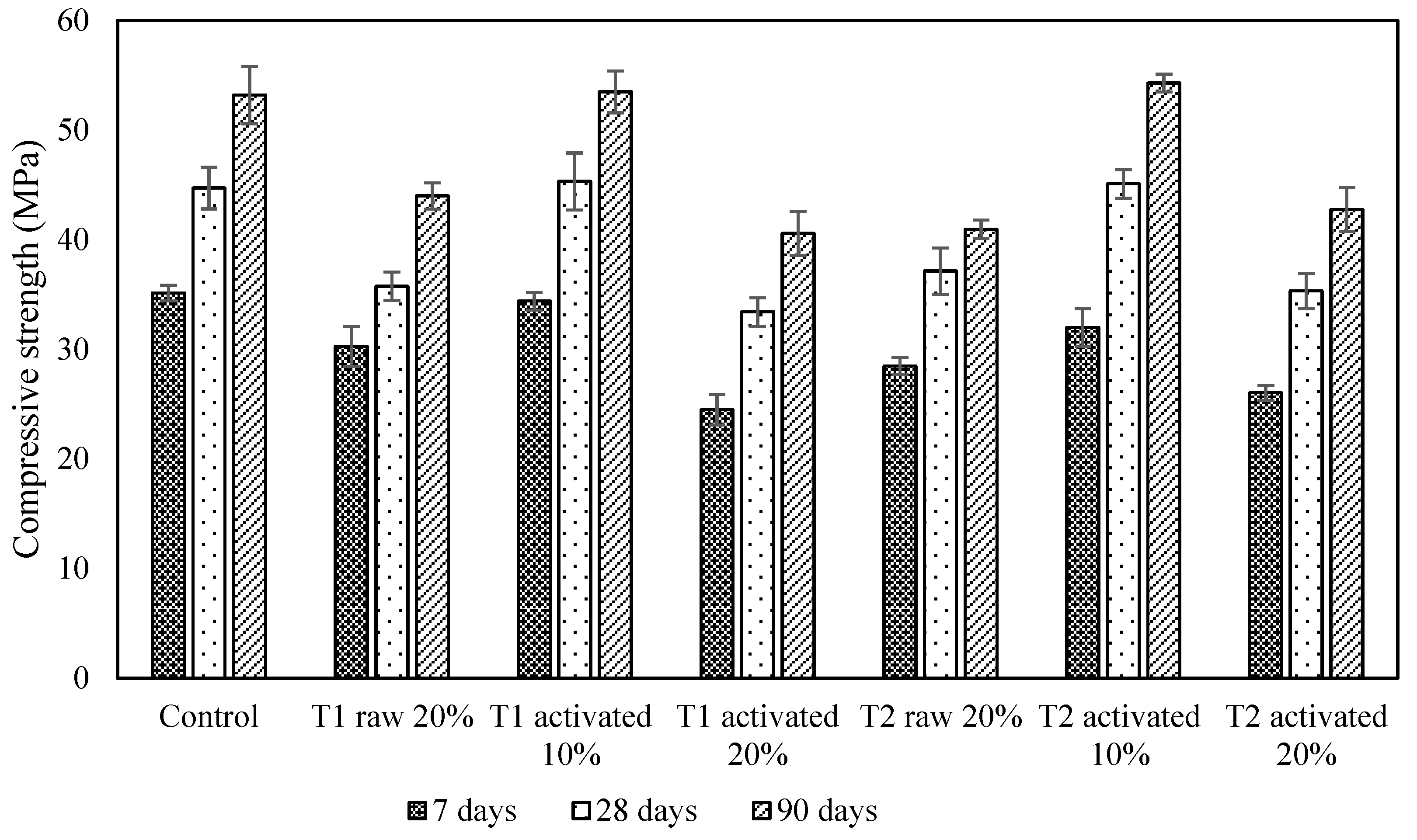 - We were able to produce two types of mortar with 45.31 MPa and 45.09 MPa by replacing 10% of OPC with tailings T1 and T2, respectively. For replacement levels above 10%, compressive strength decreased, both in the short term (7 days) and long term (90 days). The results from this study suggest that, for the optimal use of lead–zinc tailings as an SCM, cement replacement should not exceed 10%.