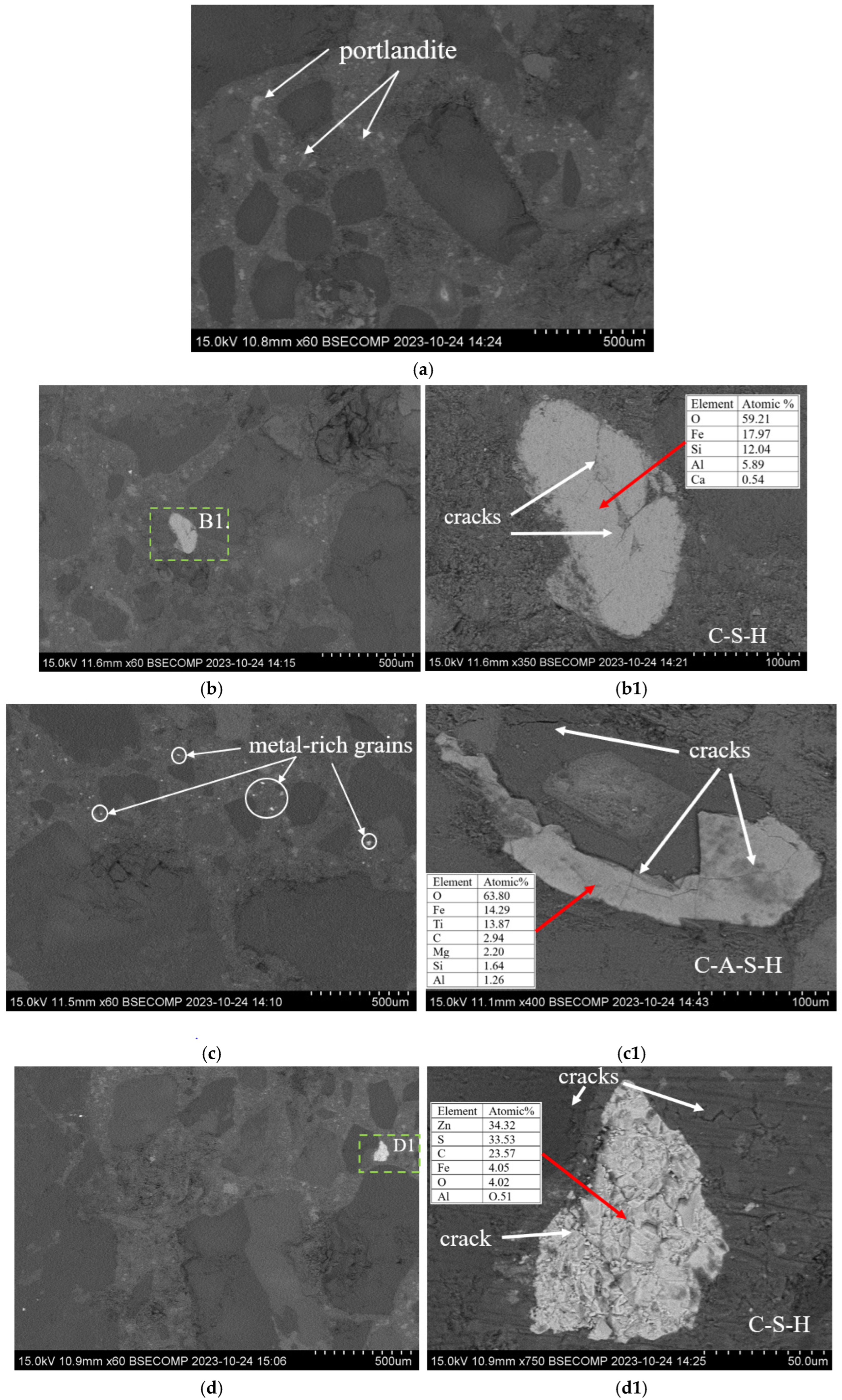 - Microstructural analysis confirms the detrimental effect of sulfides. Moreover, it shows that heavy metals are unevenly dispersed in the cement matrix in clearly distinguishable grains or regions. Microcracks were observed near such grains. It is not clear what impact this may have on the performance of the mortar; nonetheless, the presence of sulfur in such grains is associated with microcrack formation after 160 days of curing.