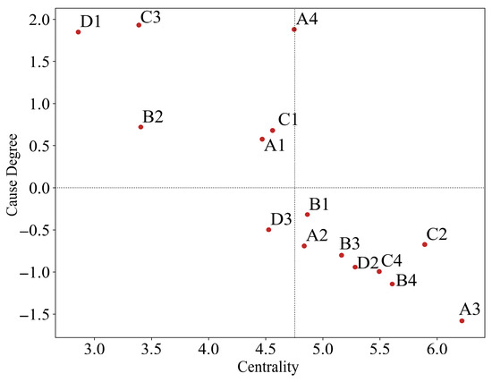 Calculations were performed in accordance with the procedure outlined in Section 3, yielding the direct influence matrix as presented in Table 4, the normalized influence matrix as presented in Table 5, and the total influence matrix as presented in Table 6. For convenience of presentation, the factor names are denoted by symbols as follows: A1—workers’ safety competency, A2—workers’ physical and mental state, A3—workers’ behavior, A4—management personnel competence; B1—equipment and facilities status and performance, B2—component quality, B3—component stacking, B4—component connection; C1—safety assurance plan, C2—construction process control, C3—policies and regulations, C4—operational coordination; D1—climatic environment, D2—hoisting operation environment, D3—organizational climate.