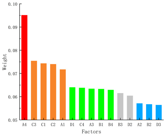 As shown in Figure 2, prefabricated hoisting construction safety factors can be roughly divided into the following levels based on their importance. The first level is management personnel competence (A4), with a weight as high as 9.51%, which constitutes the core of prefabricated hoisting construction safety factors; the second level includes policies and regulations (C3), safety assurance plan (C1), construction process control (C2), and workers’ safety competency (A1), with weights ranging from 7.17% to 7.54%, representing key dominant factors affecting prefabricated hoisting construction safety; the third level primarily includes climatic environment (D1), operational coordination (C4), workers’ behavior (A3), equipment and facilities status and performance (B1), and component connection (B4), with weights ranging from 6.29% to 6.40%. These factors are considered relatively important and warrant appropriate attention; the fourth level includes workers’ physical and mental state (A2), component quality (B2), and organizational climate (D3), with weights ranging from 5.64% to 5.71%, and their influence on hoisting construction safety is relatively limited; component stacking (B3) and hoisting operation environment (D2) lie in the transitional zone between the third and fourth levels, among which component stacking (B3) is relatively important.
