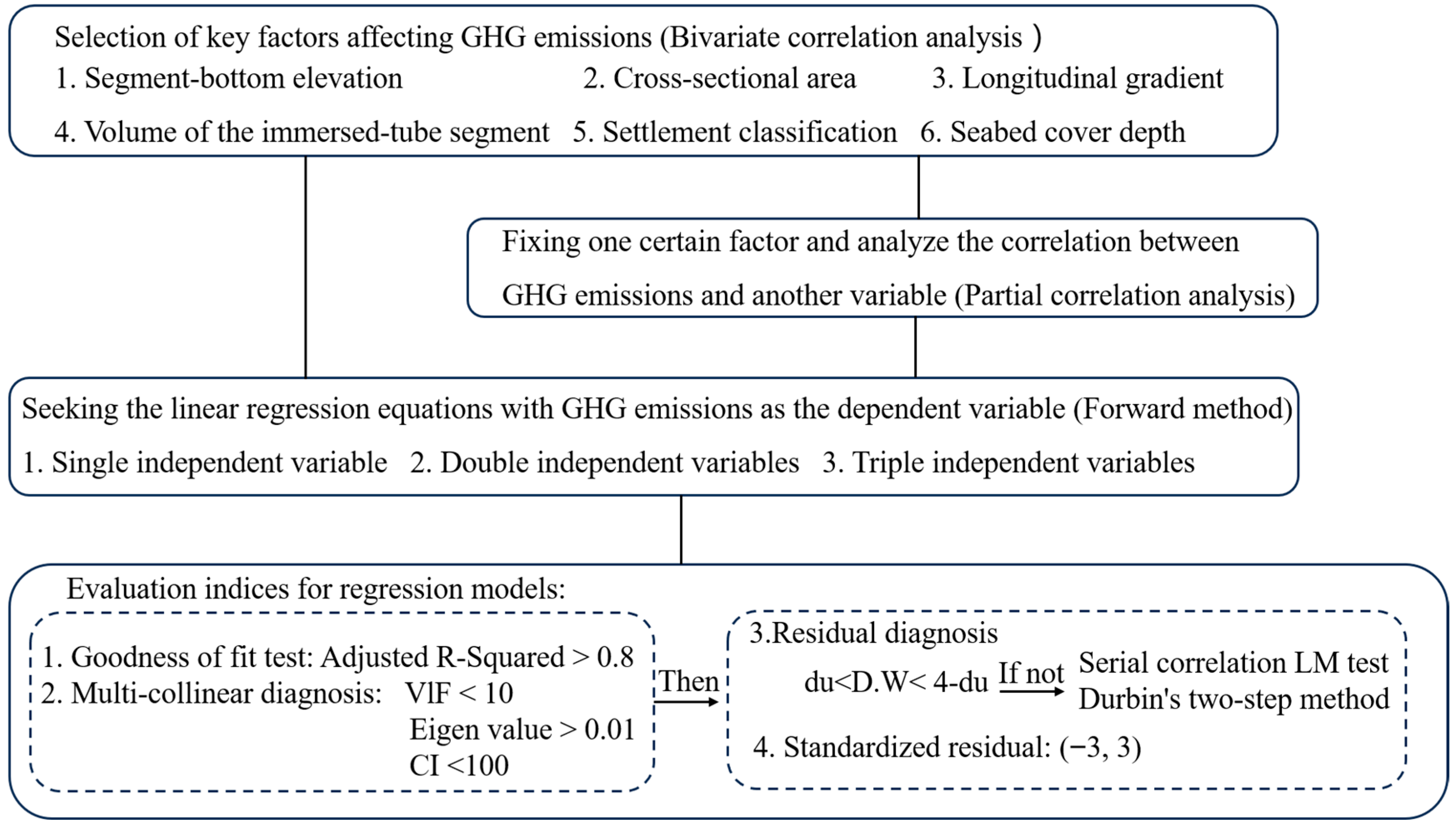The research method used in this study comprises three steps [1]: (1) proposing and defining the potential factors influencing GHG emissions from immersed tunnels; (2) developing a calculation method for GHG emissions from immersed tunnel construction based on a synthesis of existing approaches for other tunnel types; and (3) applying statistical data-analysis methods to identify the main influencing factors and establish a prediction model [31].