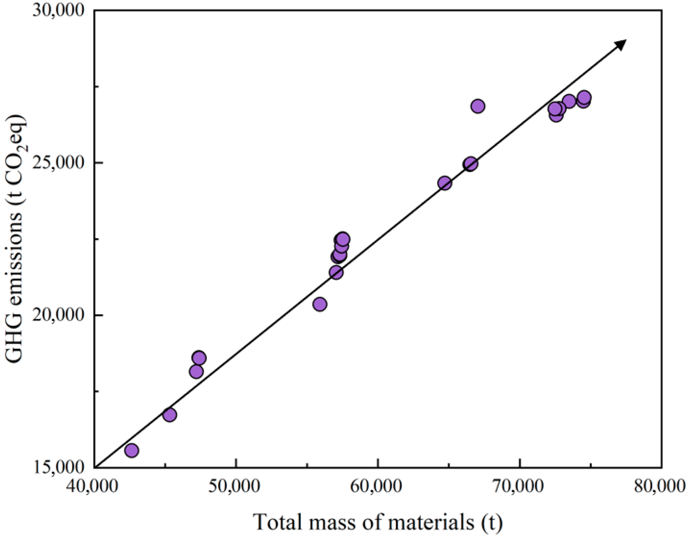 Based on the methodology described in Section 2.3, the GHG emissions of 51 immersed-tube segments were calculated, and their overall distribution is summarized as follows. Table S2 lists the material and energy inputs for all 51 immersed-tube segments. Using the inventory data in Table S2, the GHG emissions during the construction stage of each segment were obtained, as reported in Table S3. The emissions range was from 15,561.721 to 27,140.678 t CO2 eq, with an average value of 23,995.011 t CO2 eq. Figure 3 illustrates the GHG emissions from the construction of a single segment under different total masses of materials. As the material input increases, the GHG emissions per segment exhibit a clear increasing trend.